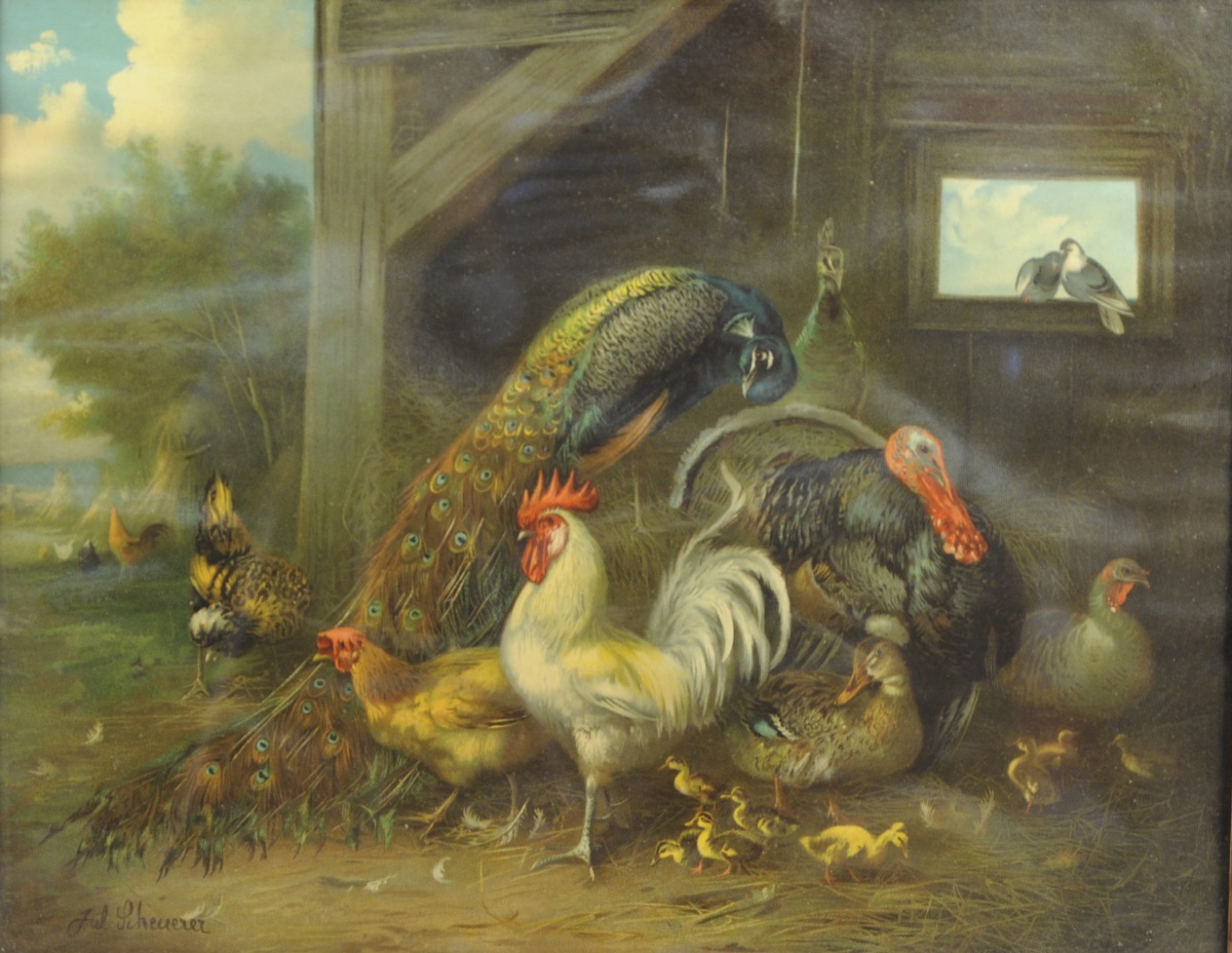 Basse-cour avec paons, coqs, poules, dindons et canards.