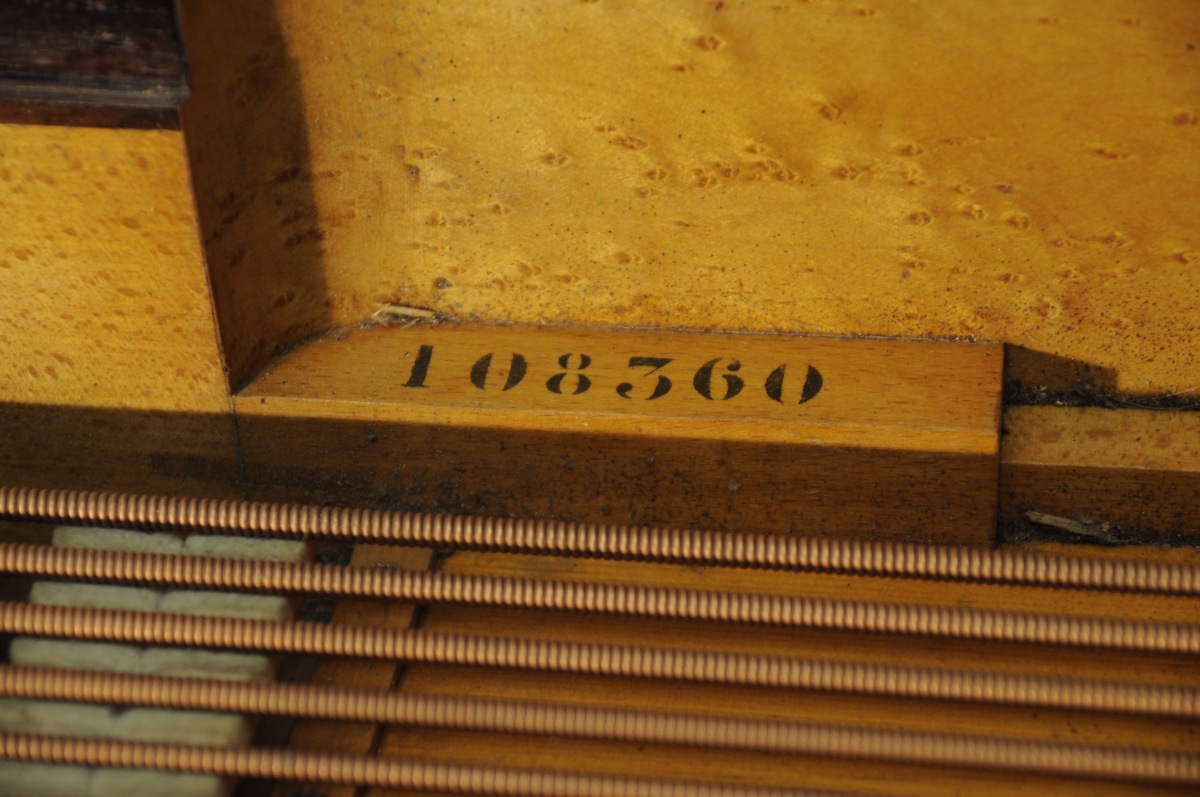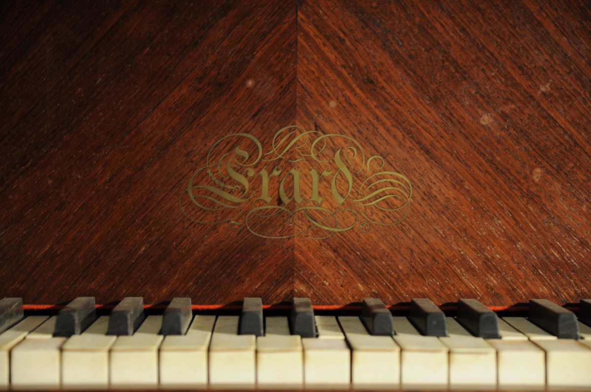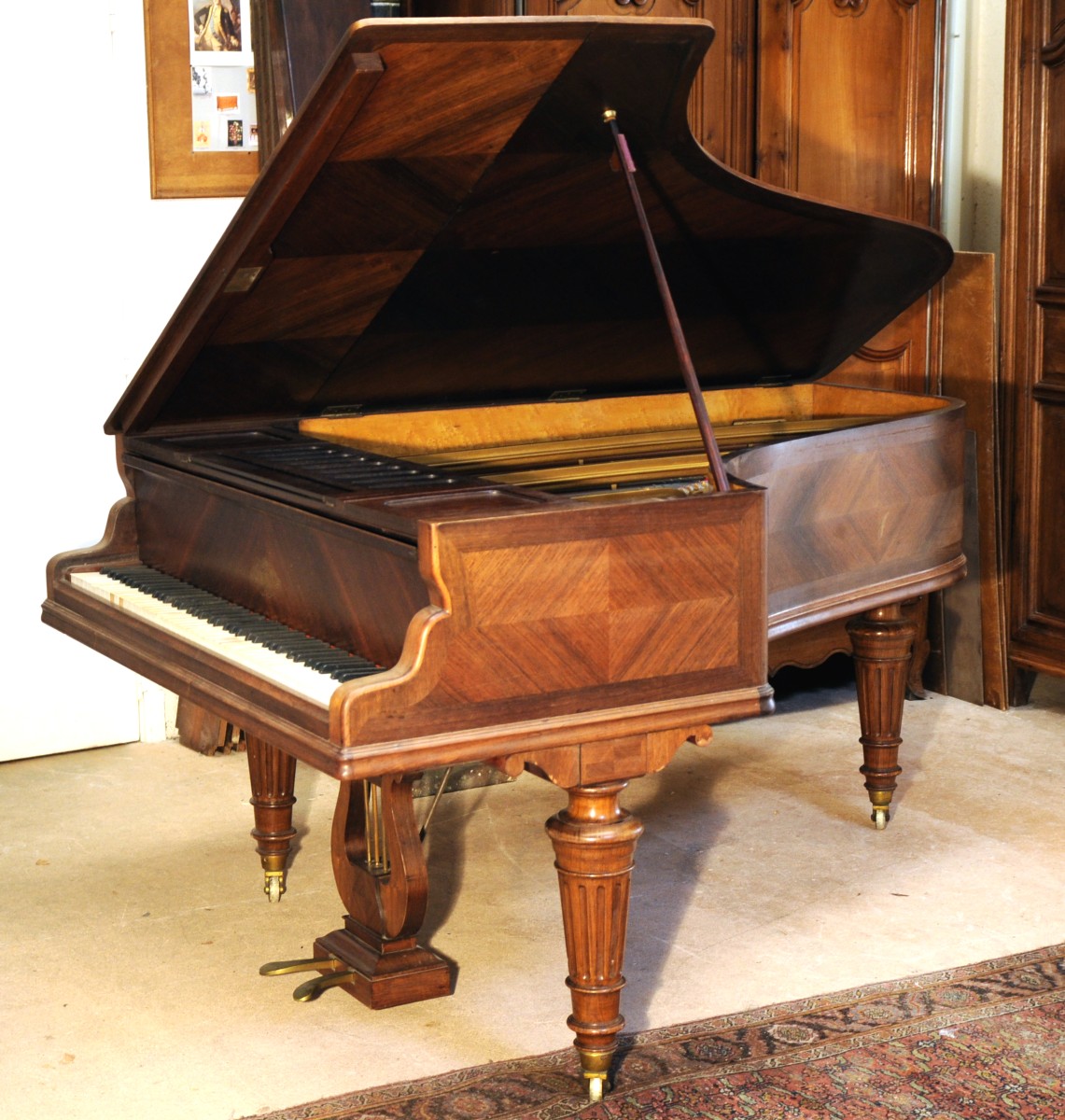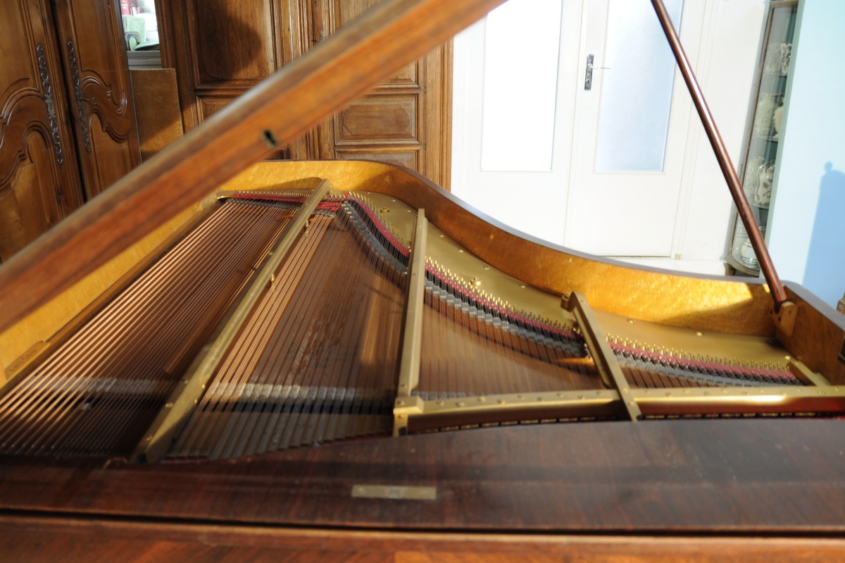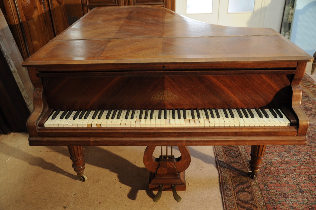 PIANO ÉRARD n° 092301 1/4 de queue en noyer teinté. Clavier en ivoire et ébène. 3 pieds tronconiques cannelés sur roulettes. Marqué "Par brevet d'invention / Seb & Pre ÉRARD / 13 et 21 rue du Mail / Paris". Début XXème. Haut. 101,3, Larg. 189,5, Prof. 136,5 cm. (manques d'ivoire sur les touches)