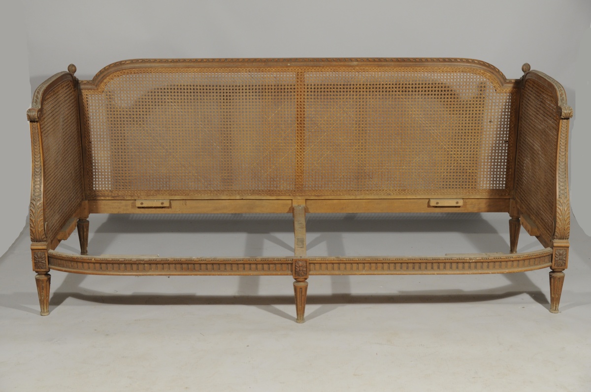 CANAPÉ canné en hêtre ciré et mouluré. Traverses et accotoirs cintrés. Consoles d'accotoirs galbées. Pieds toupies cannelés. Décor de frises de rubans, chapelet, cannelures, bobèches en forme de grenade éclatées et dés de raccordement ornés de feuilles d'acanthe stylisées. Style Louis XVI. XIXème. Haut. 88, Larg. 199,2, Prof. 77,7 cm. (manque l'assise)