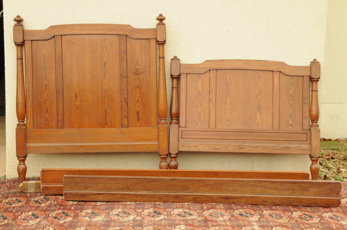 Bois de LIT en résineux teinté. Montant tournés en balustre. Bobèches à l'amortissement. Monté sur roulettes. Travail contemporain. XXème. Haut. 127,7, Larg. 110 cm et Haut. 98, Larg. 110 cm.