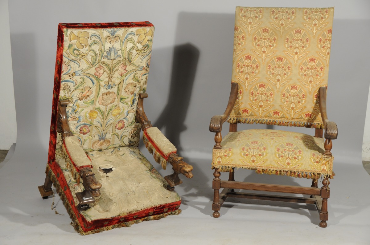- Un FAUTEUIL à haut dossier en chêne teinté, mouluré et sculpté. Accotoirs à manchettes à décor de feuillages stylisés et têtes de lions. Dossier et assise garnis d'une tapisserie ornée de feuillages et de velours rouge. Style Louis XIII. Fin XIXème. Haut. 122, Larg. 57,5, Prof. 54,2 cm. (pieds antérieurs manquant)