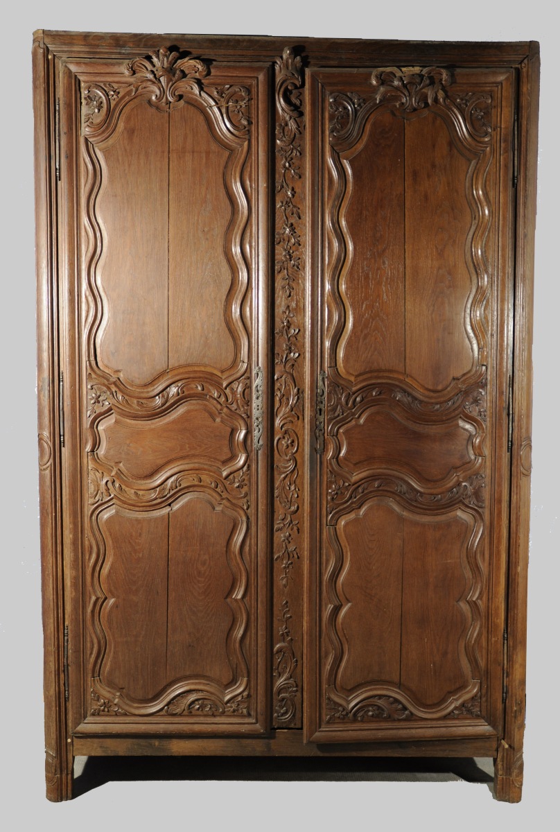 ARMOIRE en chêne teinté, mouluré et sculpté, ouvrant à deux vantaux. Pieds droits dans le prolongement des montants. Décor de panneaux moulurés, de rinceaux feuillagés et de fleurettes. Dormant à décor de fleurs et feuillages. Haut. 232, larg. 150,5, Prof. 63,5 cm. Style Louis XV. Fin XIXème. (usures et accidents)