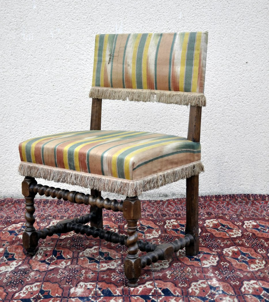 CHAISE à large assise en noyer tourné et teinté. Pieds antérieurs torsadés. Pieds postérieurs droits. Piètement en H. Style Louis XIII. Fin XIXème. Haut. 91,5, Larg. 59, Prof. 46 cm.