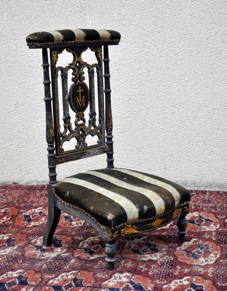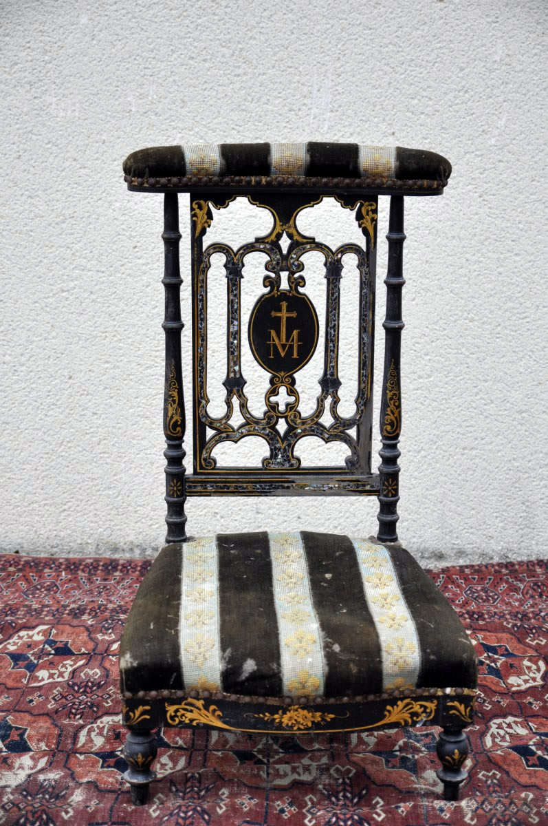 PRIE-DIEU en bois noirci tourné et sculpté. Décor burgauté et rinceaux or. Pieds antérieurs tournés. Monogramme "M" avec une croix. Napoléon III. Milieu XIXème. Haut. 85,5, Larg. 46, Prof. 44 cm. (usures)