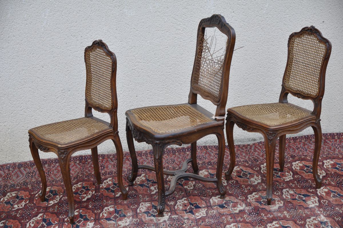 Joint : une chaise cannée en hêtre teinté mouluré et sculpté de fleurs, agrafes, feuillages et coquilles stylisées. Pieds galbés se terminant en volutes. Style Régence. Début XXème. (manques au cannage)