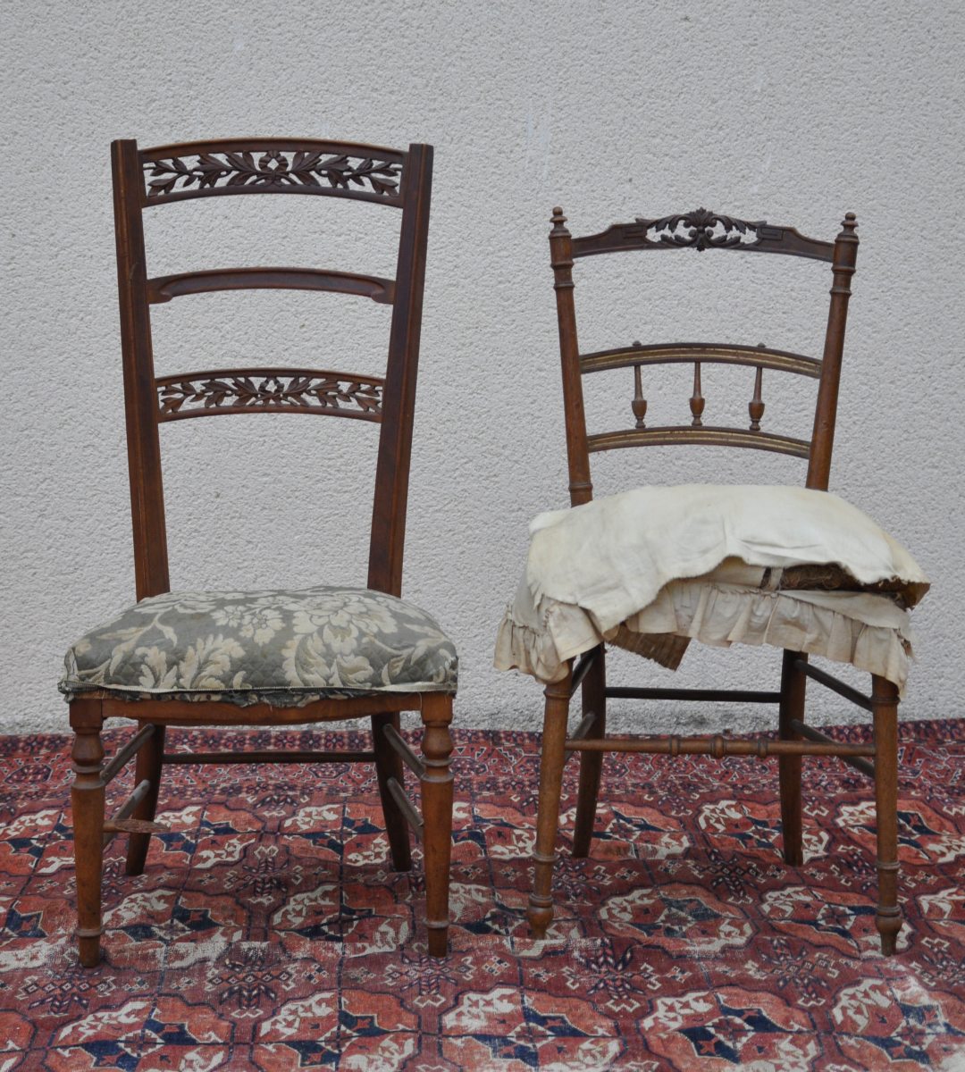 RÉUNION d'une chaise volante et d'une chaise de nourrice en noyer mouluré, tourné et sculpté. Dossiers ajourés de feuilles d'acanthe stylisées, de balustres et de guirlandes feuillagées. Début XXème. Haut. 94, Larg. 43, Prof. 39 cm et Haut. 85, Larg. 42, Prof. 38 cm. (garniture éventrée sur l'une, accidents et manques)