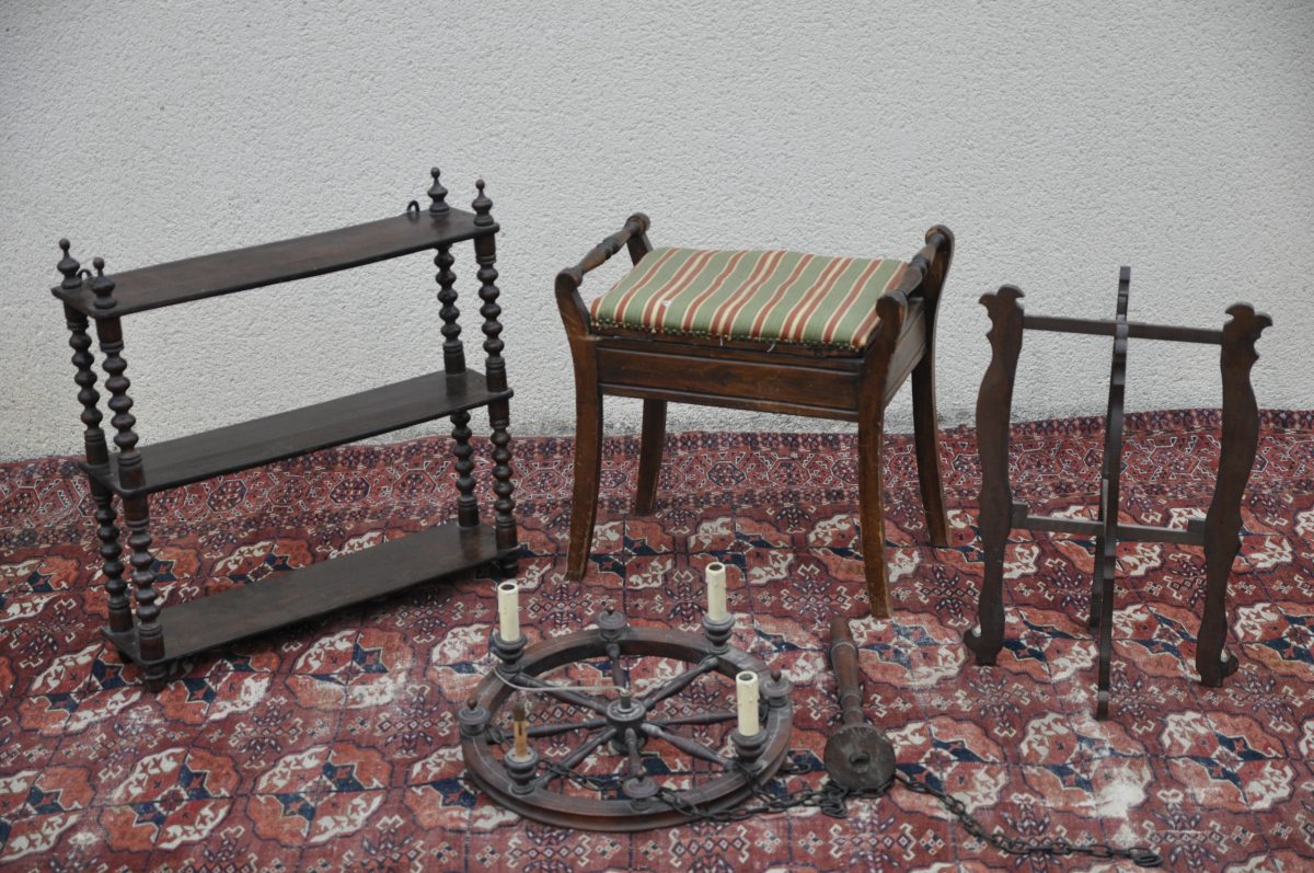 - Une suspension à cinq lumières en bois tourné et teinté en forme de roue agrémentée de bobèches. Monté à l'électricité. Haut. 62, Diam. De la roue 44 cm.