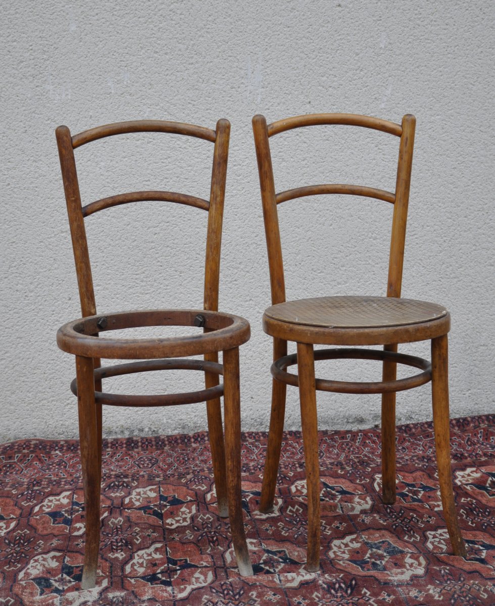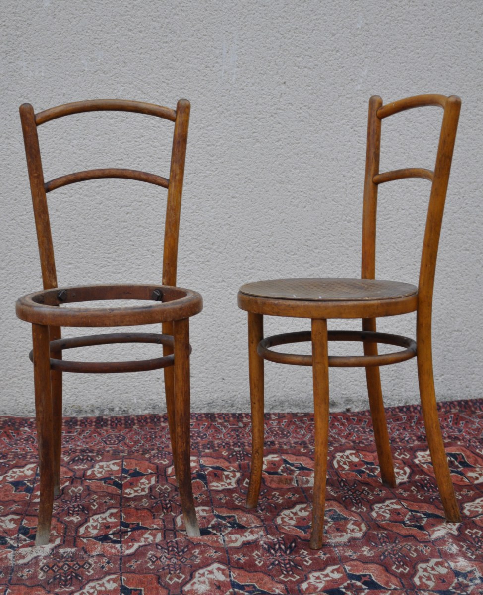 VIENNE. PAIRE DE CHAISES BISTROT en hêtre courbé à la vapeur. Assise en bois imitant le cannage. Marque au feu " J & J KOHN / WIEN-AUSTRIA " et étiquette " Jacob & Josef KOHN / Wien / registrirte / Schutzmarke ". Haut. 85, Larg. 37, Prof. 40 cm. (légères usures, manque une assise)