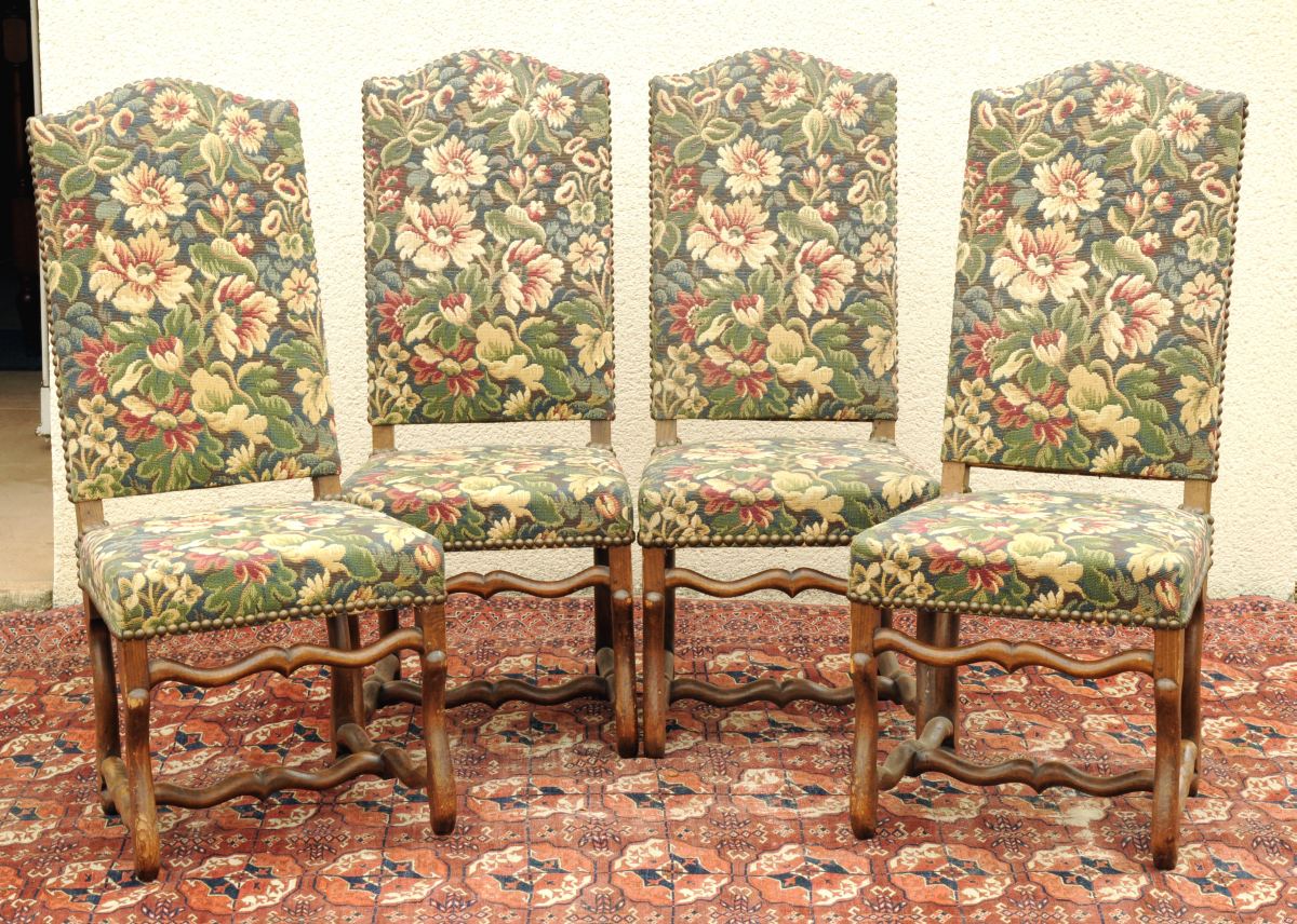 SUITE de quatre chaises à haut dossier en bois naturel. Pieds en " os de moutons " réunis par une entretoise en " H ". Garnis d'une tapisserie au petit point contemporaine. Style Louis XIII, XXème. Haut. 108, Larg. 46, Prof. 46 cm.
