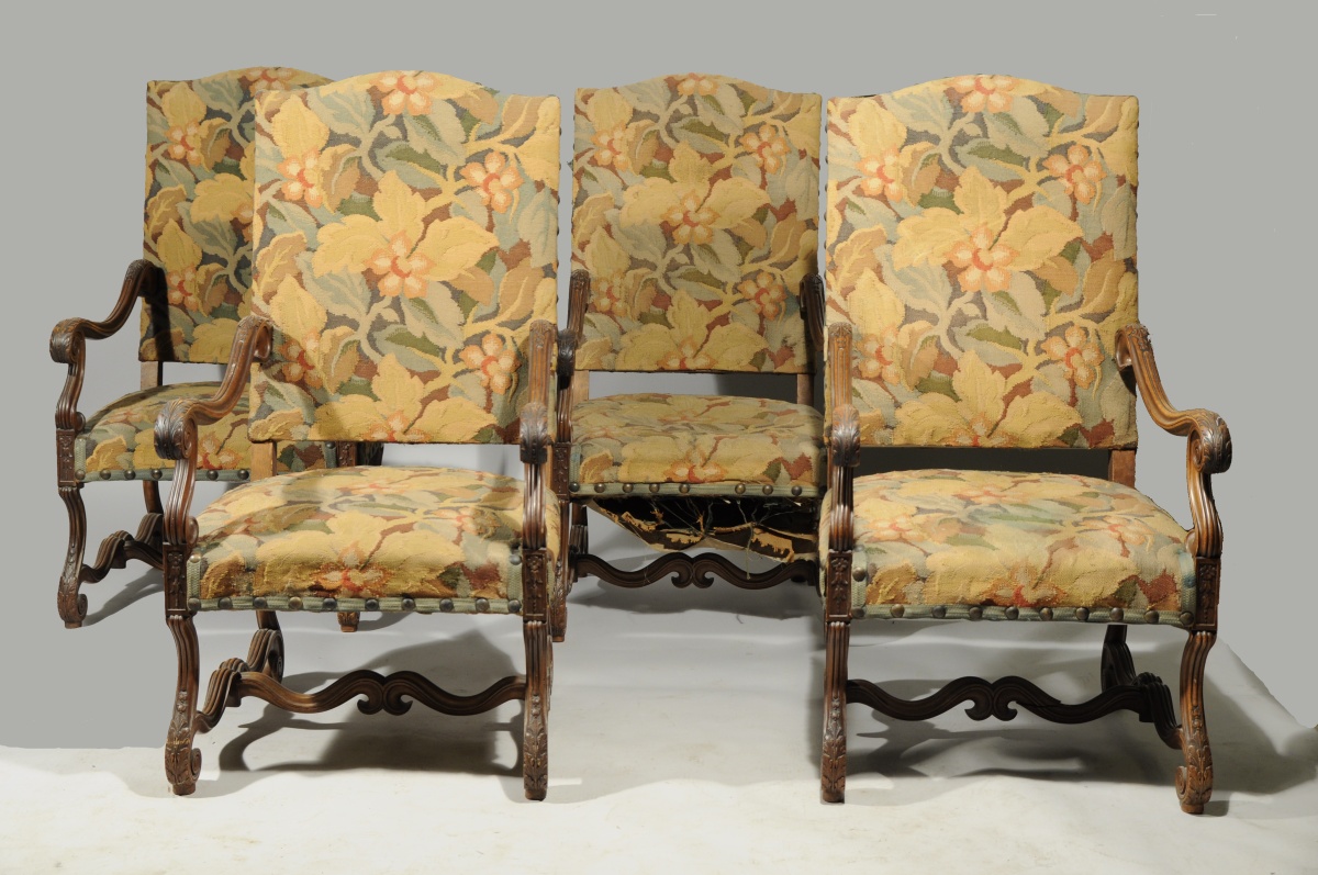 SUITE de quatre chaises à bras en noyer mouluré et sculpté de feuilles d'acanthes et enroulement. Accotoirs et pieds mouvementés se terminant en enroulement, entretoise mouvementée en " H ". Garnis d'une tapisserie au petit point contemporaine. Style louis XIII. Début XXème. Haut. 116, Larg. 61, Prof. 60 cm. (usures)