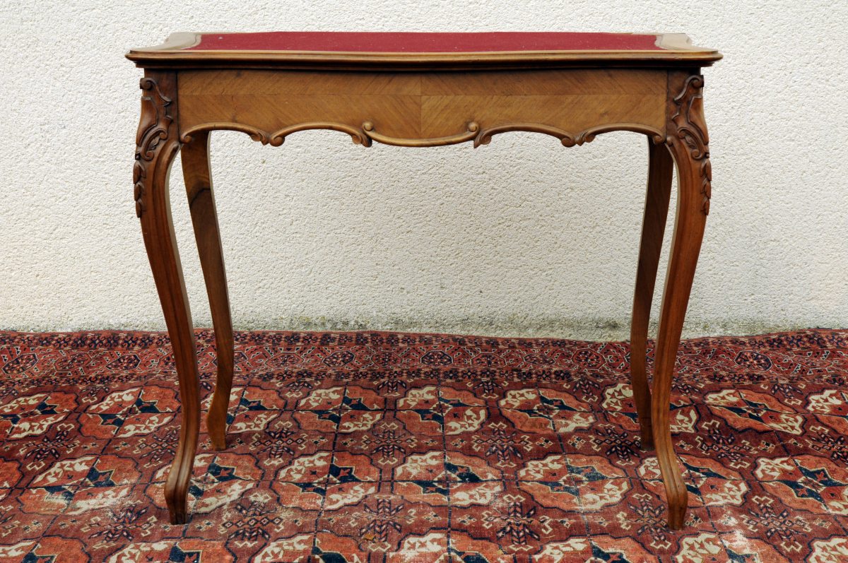 TABLE à JEU dite " portefeuille " en noyer et frisage de noyer reposant sur quatre pieds cambrés sculptés d'un cartouche stylisé et d'une chute feuillagée. Plateau foncé d'un feutre bordeaux. XXème. Haut. 74, Larg. 86, Prof. 43 cm. (tâches sur le plateau)