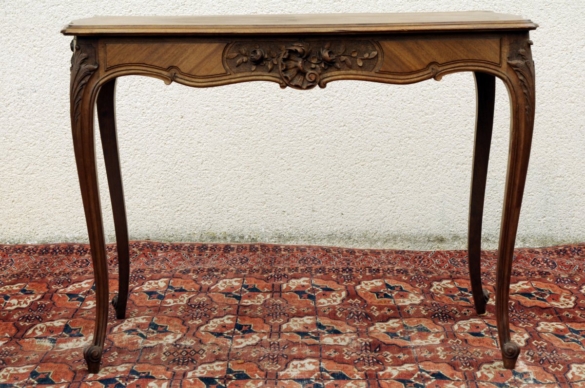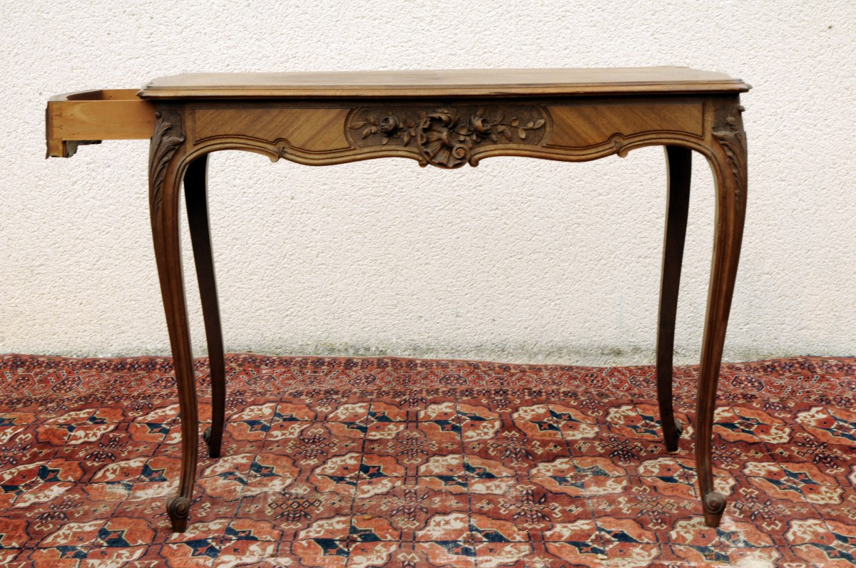 TABLE-BUREAU à plateau mouvementé en noyer et placage de noyer ouvrant en ceinture par un tiroir. Elle repose sur quatre pieds cambrés terminés par un enroulement. Montants et ceinture sculptés de coquilles stylisées, fleurs et branches feuillagées et feuilles d'acanthe stylisées. Fin XIXème - début XXème. Haut. 73, Larg. 100, Prof. 60,5 cm.