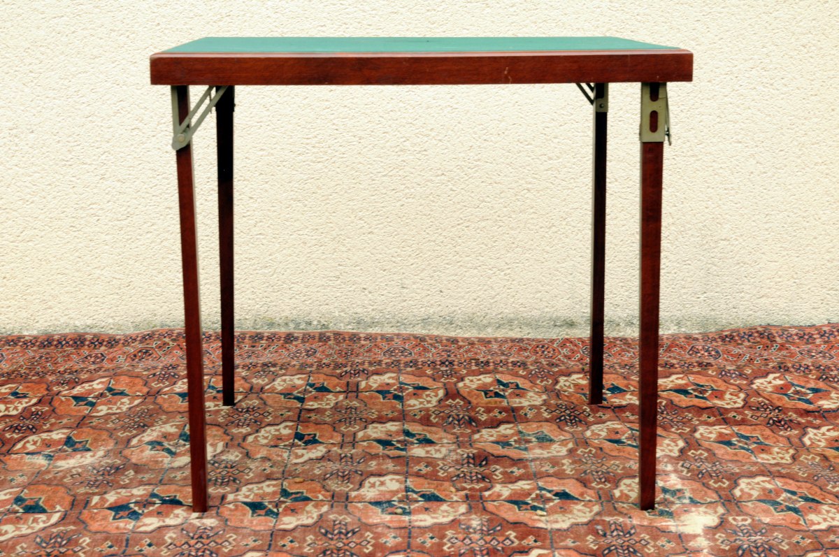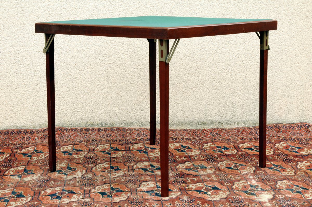 TABLE de BRIDGE pliante en bois teinté. Plateau foncé d'un feutre vert. XXème. Haut. 69,1, Larg. 77,8, Prof. 77,8 cm.
