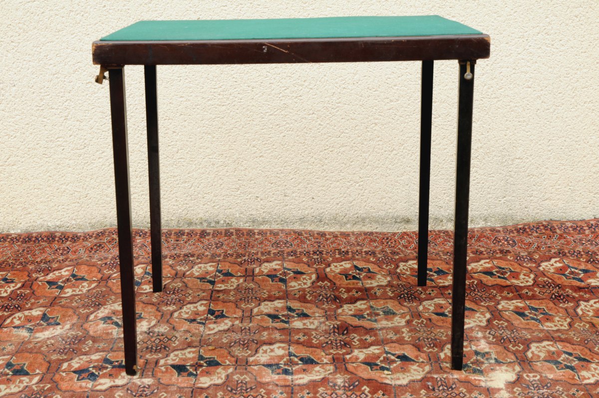 TABLE de BRIDGE pliante en bois teinté. Plateau foncé d'un feutre vert. XXème. Haut. 69,5, Larg. 77,9, Prof. 77,8 cm.