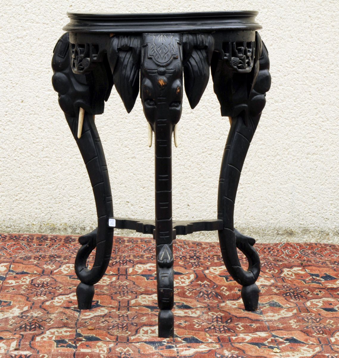 GUÉRIDON tripode en bois noirci, mouluré et sculpté. Plateau circulaire. Pieds en forme de tête d'éléphant. ceinture ajourée de fleurs de lotus et de motifs géométriques. Travail d'Extrême-Orient. XXème. Haut. 66,5, Diam. 41,2 cm. (usures)