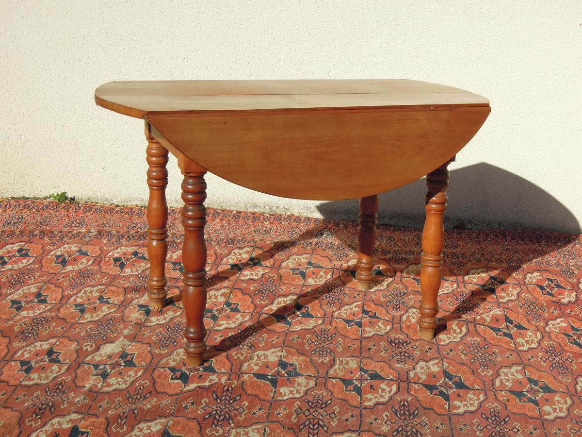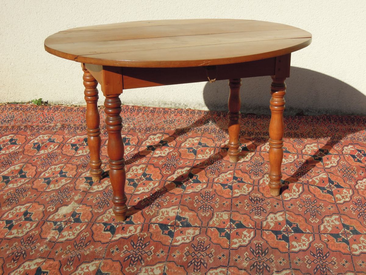 PETITE TABLE de salle à manger en merisier ciré et tourné. Plateau ovale à deux volets. Pieds balustre. Style Louis-Phillipe. Milieu XIXème. Haut. 63, Larg. 99,8, Prof. 84 cm.