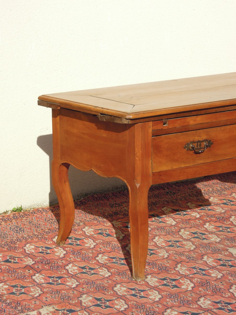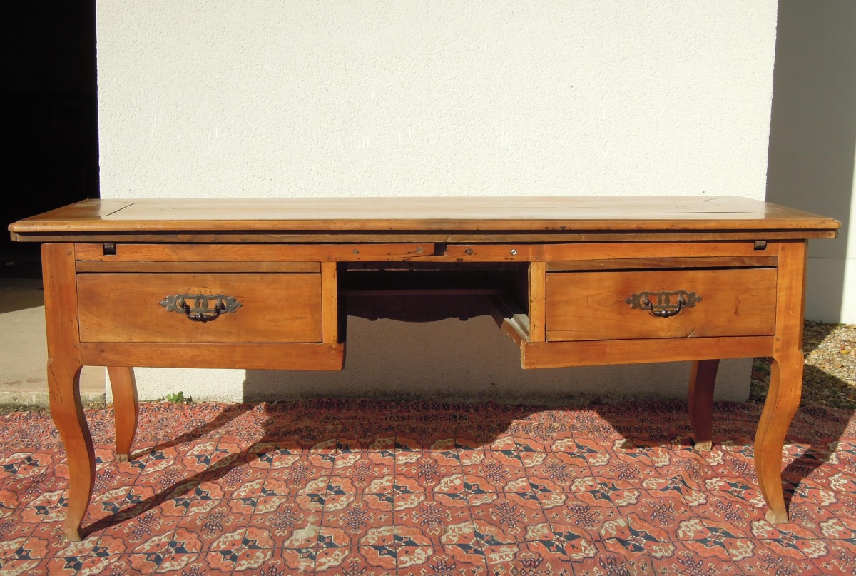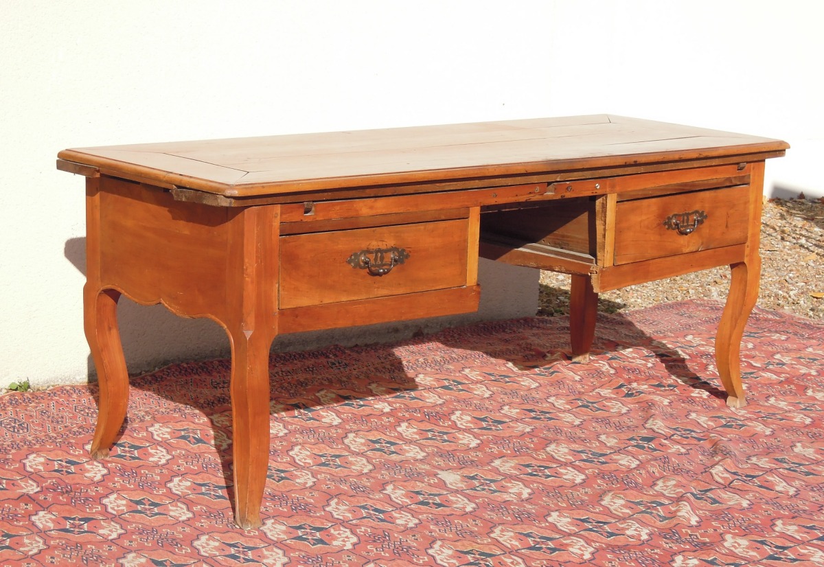 GRAND BUREAU PLAT en merisier ciré et mouluré ouvrant par deux tiroirs en façade. Plateau amovible. Pieds cambrés. Haut. 80,7, Larg. 201, Prof. 75 cm. (transformations, accidents et manques)