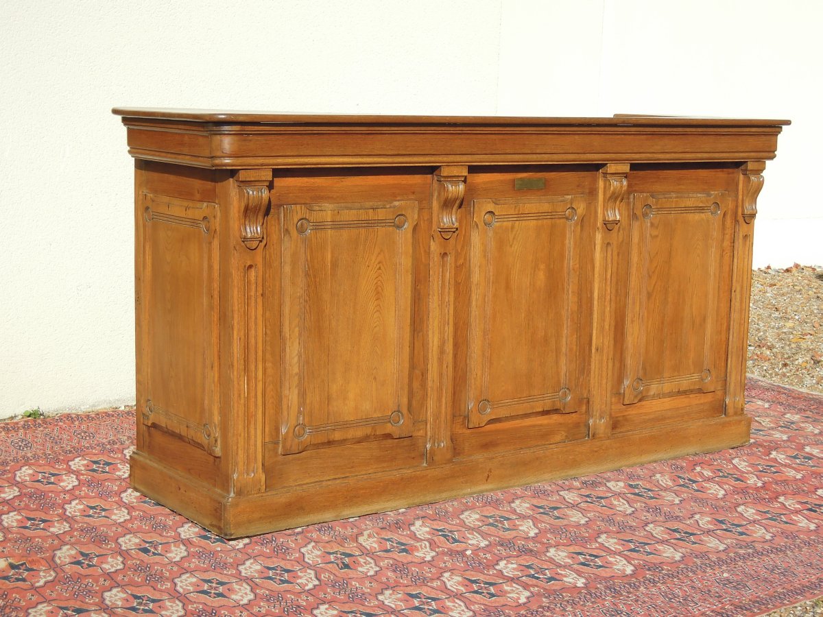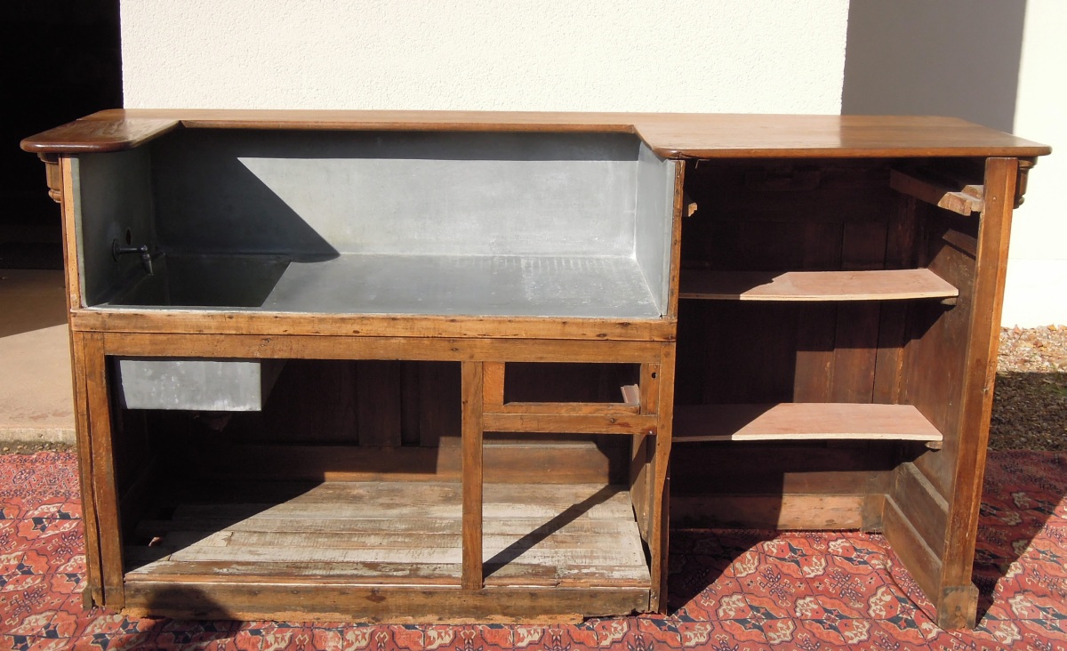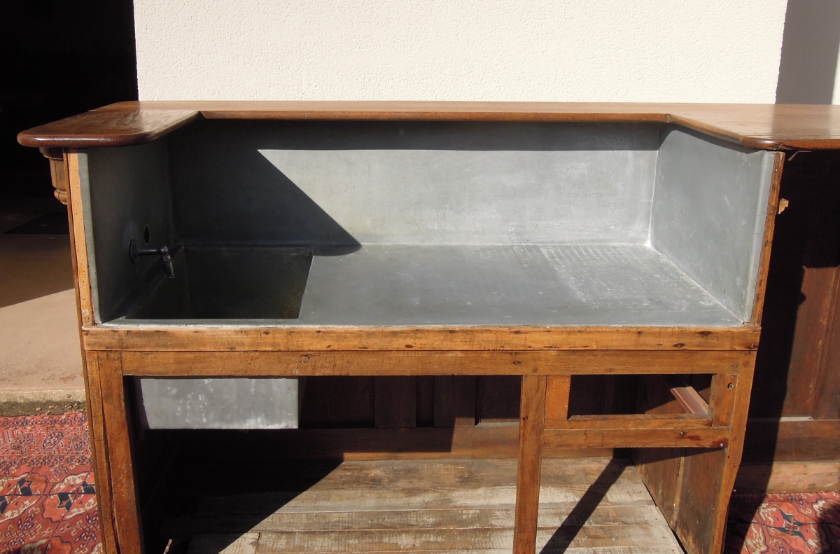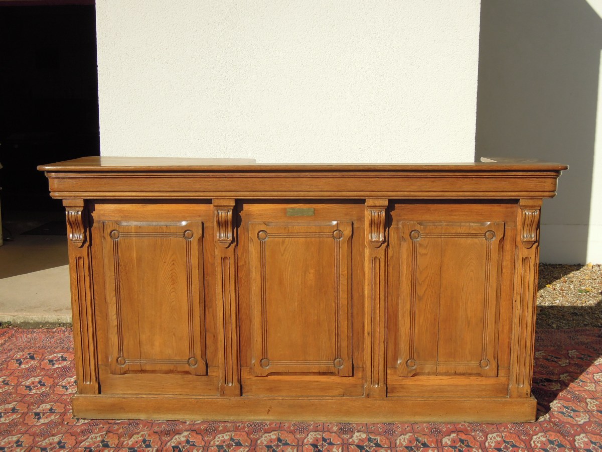 COMPTOIR DE BISTROT en chêne ciré et mouluré. Il présente sur l'arrière un décrochement avec un évier en zinc et des espaces de rangement. Plaque en laiton des "Établissements B.B.F" (Brassard, Bacquier et Frimbaud). Travail français. Début XXème. Haut. 118, Larg. 230,3, Prof. 70,5 cm. (petits accidents et manques)
