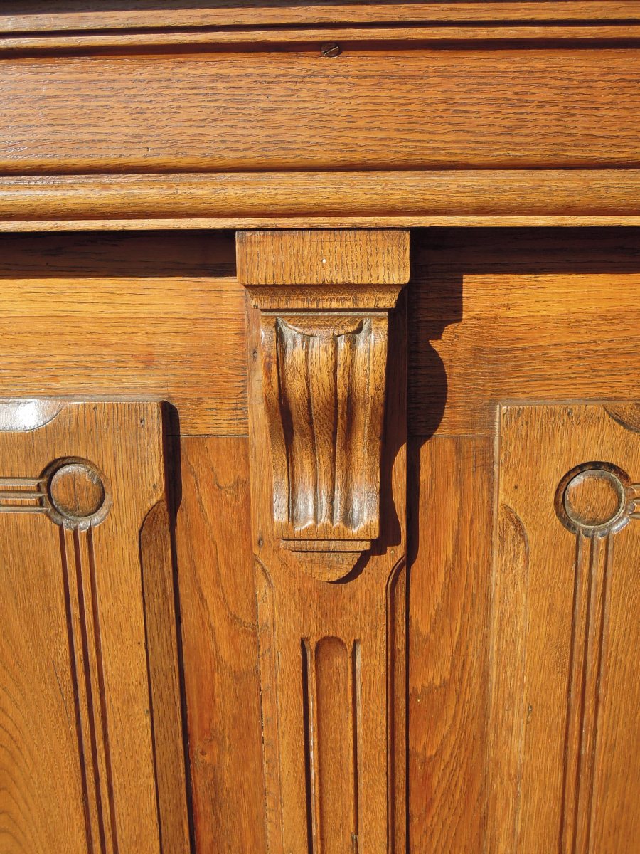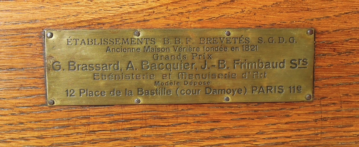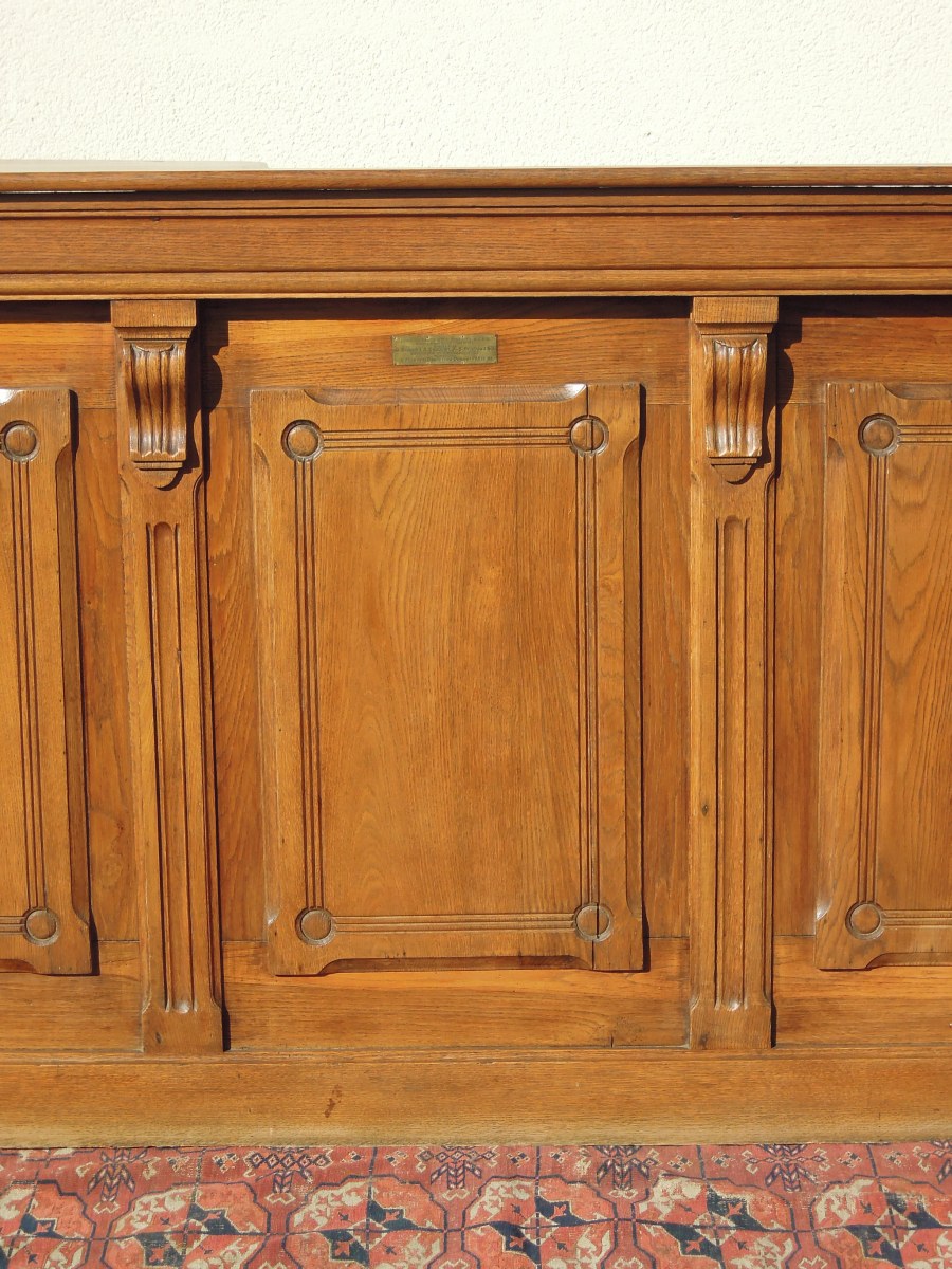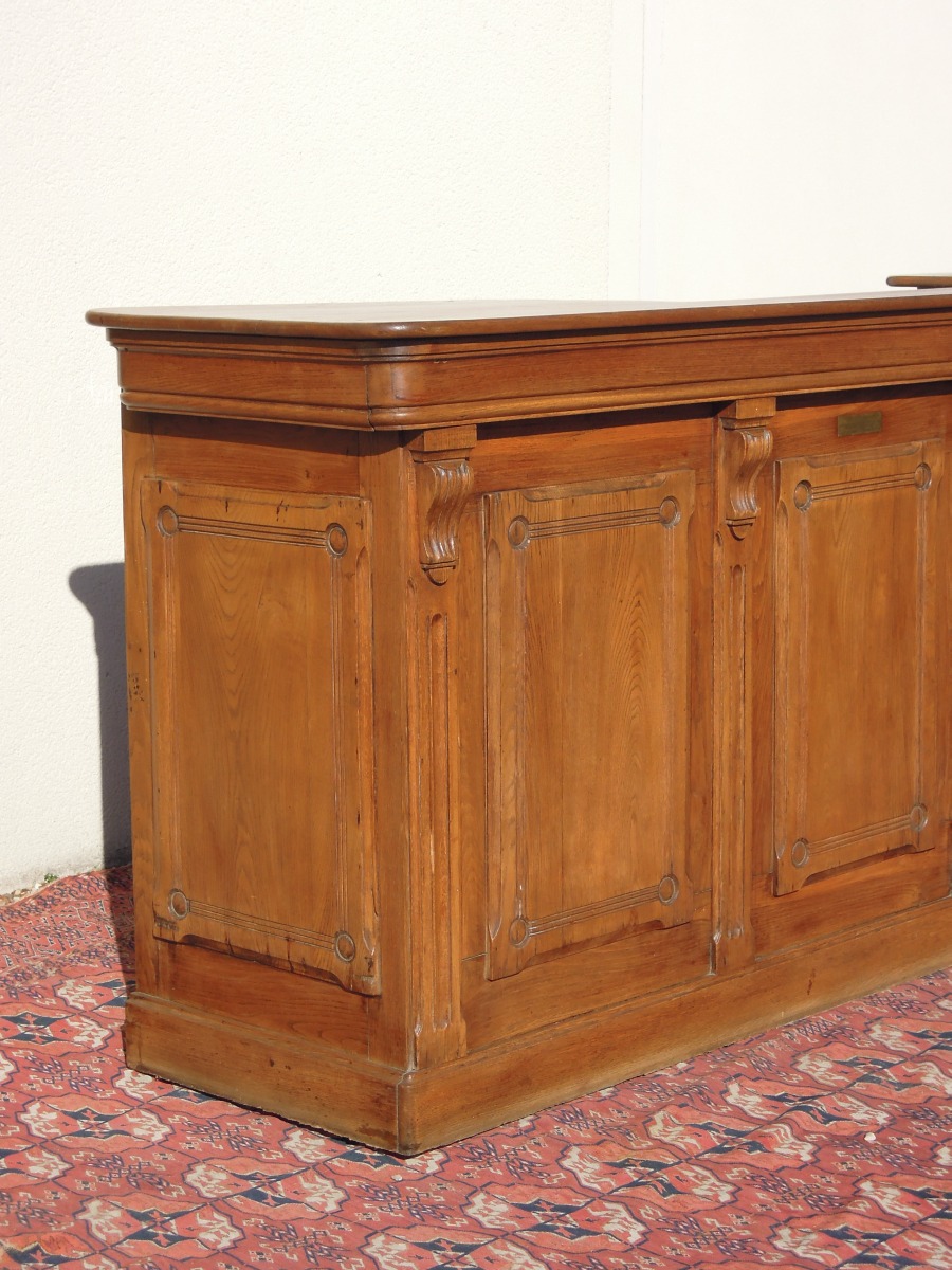 COMPTOIR DE BISTROT en chêne ciré et mouluré. Il présente sur l'arrière un décrochement avec un évier en zinc et des espaces de rangement. Plaque en laiton des "Établissements B.B.F" (Brassard, Bacquier et Frimbaud). Travail français. Début XXème. Haut. 118, Larg. 230,3, Prof. 70,5 cm. (petits accidents et manques)