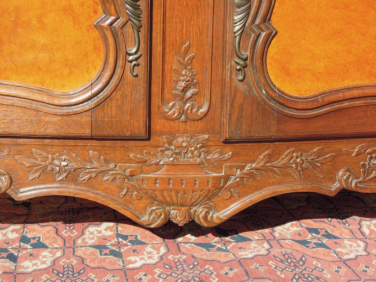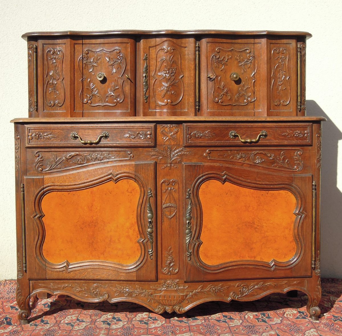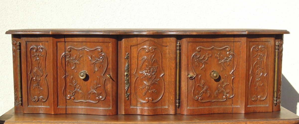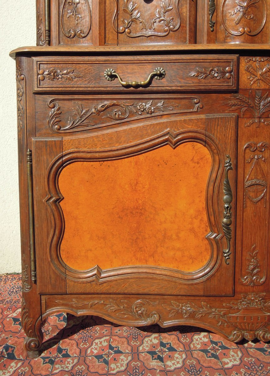 BUFFET en chêne mouluré et sculpté et panneaux en loupe de noyer. Partie supérieure en retrait ouvrant par trois vantaux. Partie basse ouvrant par deux tiroirs et deux vantaux. Décor d'épis de blé, d'un carquois, d'une torche, de guirlandes et bouquets de fleurs et de feuillages.