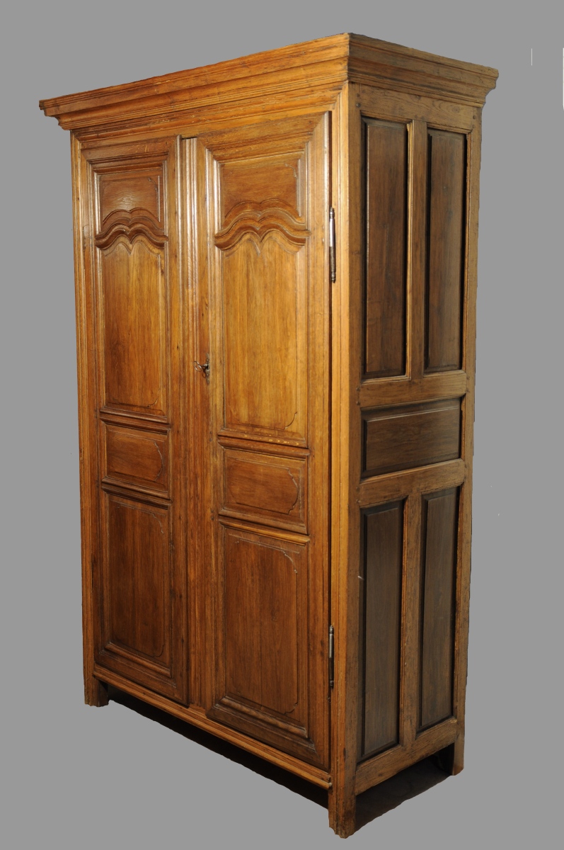 ARMOIRE en chêne et bois naturel mouluré et teinté, ouvrant par deux portes en façade, deux tiroirs et penderie à l'intérieur. Corniche, traverse et pieds droits. Travail du nord de la France. XIXème. Haut. 218,5, Larg. 130, Prof. 56 cm.