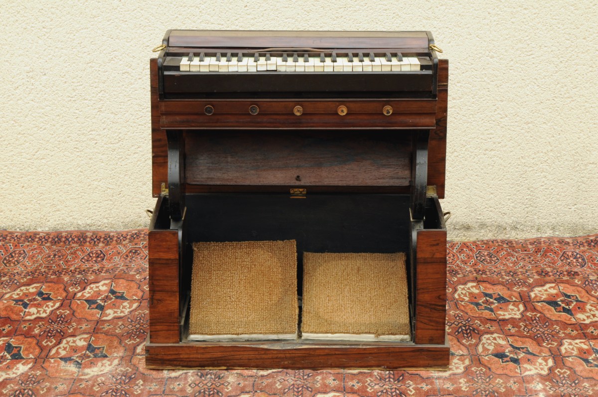 "PIANO" DE VOYAGE anglais. Harmonium à caisse en acajou, à 42 touches, les blanches en ivoire, et à cinq tirettes de modulation. Piétement pliant, pour le transport en coffre.