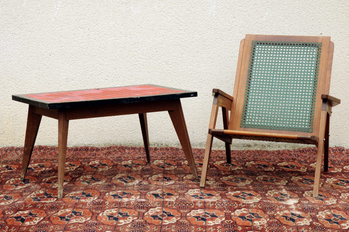 ENSEMBLE COLONIAL composé d'un FAUTEUIL VISITEUR en bois à fond canné vert et d'une TABLE BASSE à dessus en toile cirée. Travail inspiré de Victor Prouvé. Années 1960. Fauteuil : Haut. 78, Larg. 56, Prof. 56 cm ; Table : Haut. 48, Larg. 85, Prof. 54 cm.