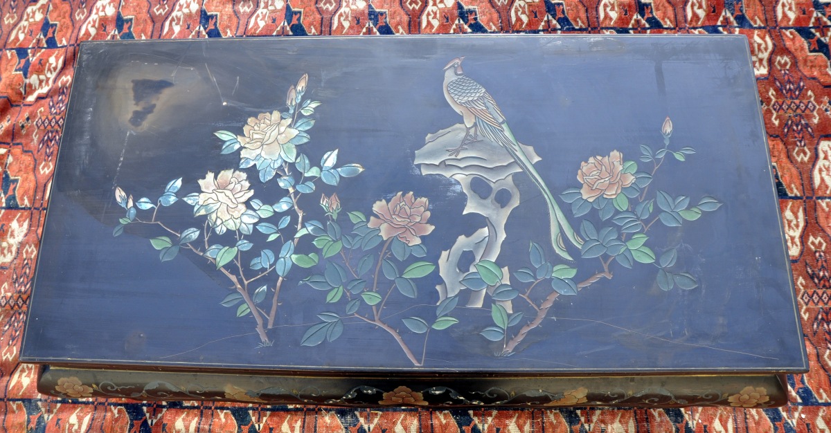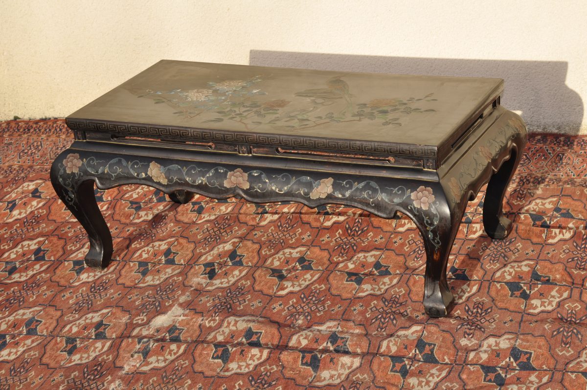 TABLE BASSE en bois laqué noir. Décor de branchages de roses et d'un oiseau exotique sur le plateau. Traverses mouvementées à décor de roses, feuillages et frise de grecques. Pieds cambrés. Dans le goût de la Chine. Début du XXème. Haut. 44, Larg. 97, Prof. 46,6 cm.