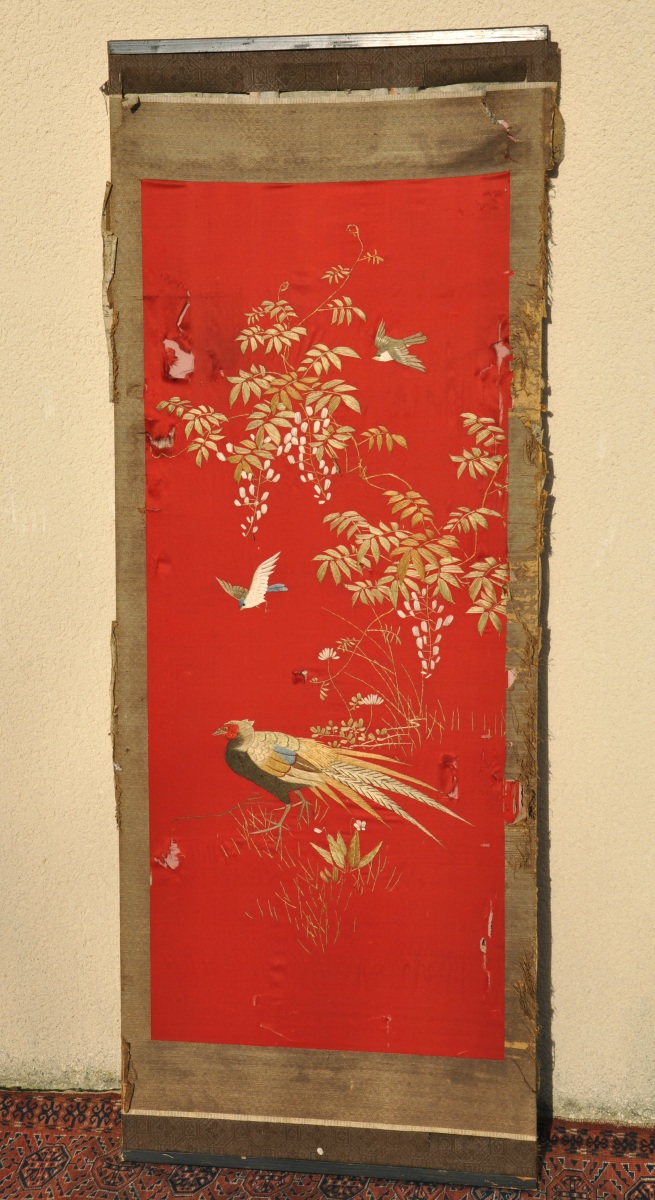 ÉLÉMENT de PARAVANT recouvert d'une soierie représentant un faisan et deus petits oiseaux volants dans des feuillages sur un fond rouge. Travail d'Extrême-Orient. Fin XIXème. (usures et déchirements)