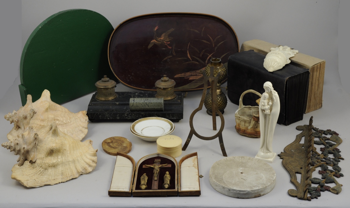 LOT comprenant : un console d'applique en bois, une lampe à pince, un registre de courrier, un encrier en marbre, un registre de courrier en cuir, deux coquillages, une lampe pigeon, un autel portatif, un bénitier en faïence fine crème, une Vierge à l'Enfant en porcelaine, trois éléments en porcelaine, un plateau laqué, un porte-pipe, un cadran solaire, une boîte circulaire en plastique 'ivoire'. (accidents et manques)
