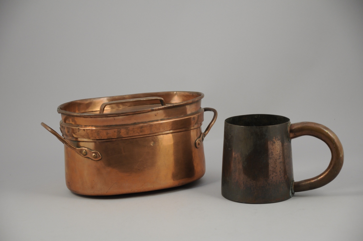 -Une choppe de forme tronconique comprenant une importe poignée soudée. Début XXème. Haut. 14,8, Larg. 22 cm.