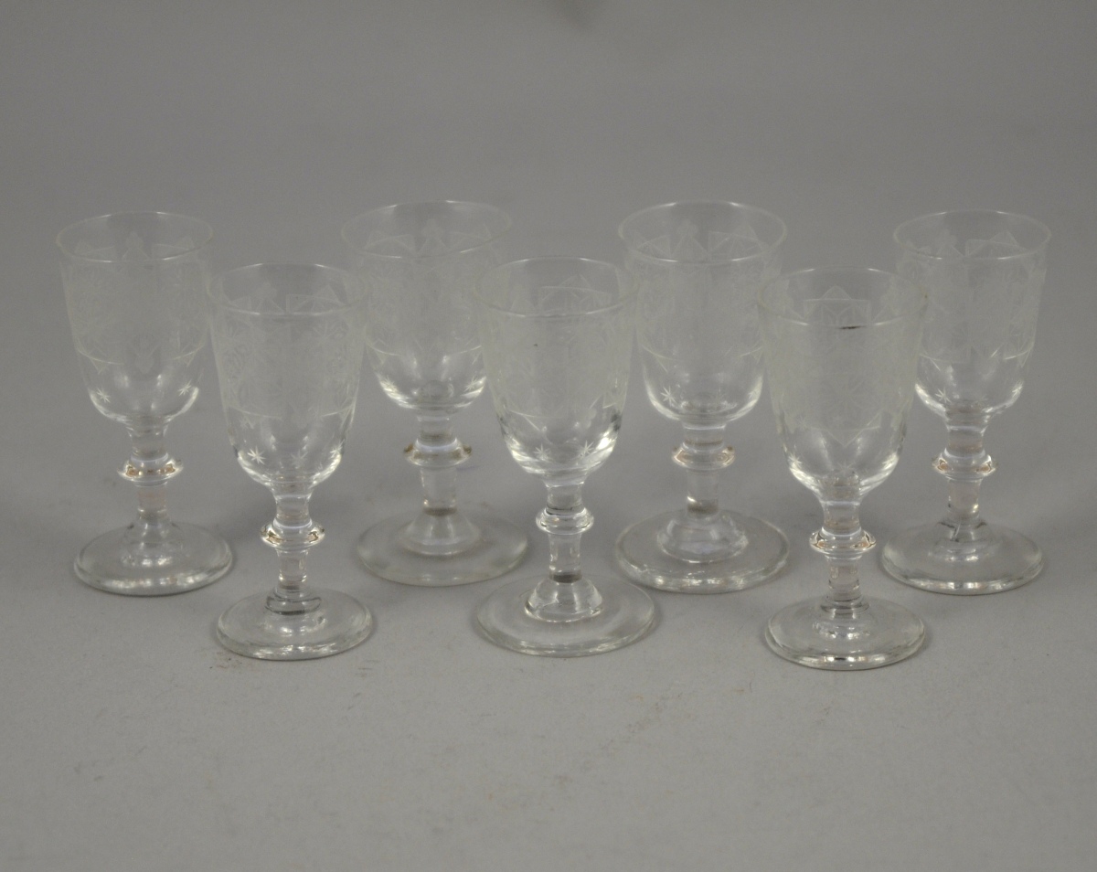 Ensemble de sept VERRES à LIQUEUR en demi-cristal à décor gravé de motifs géométriques tels que rosaces et étoiles. Haut. 8,5 cm.