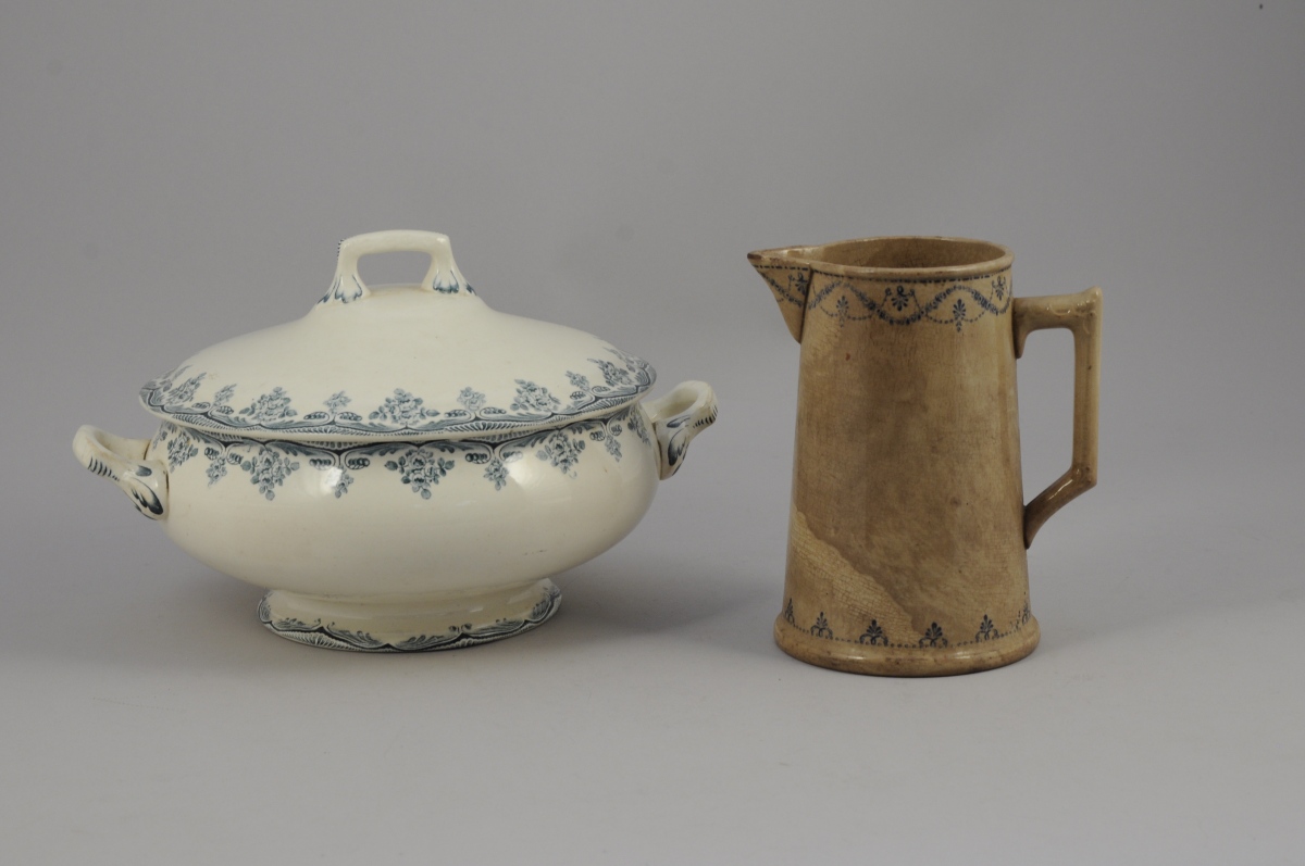 -GIEN. Pichet en porcelaine opaque à décor bleu de guirlandes de fleurs et entrelacs. Marque de 1886-1938. Haut. 19 cm. (accidents, manques et décoloration)