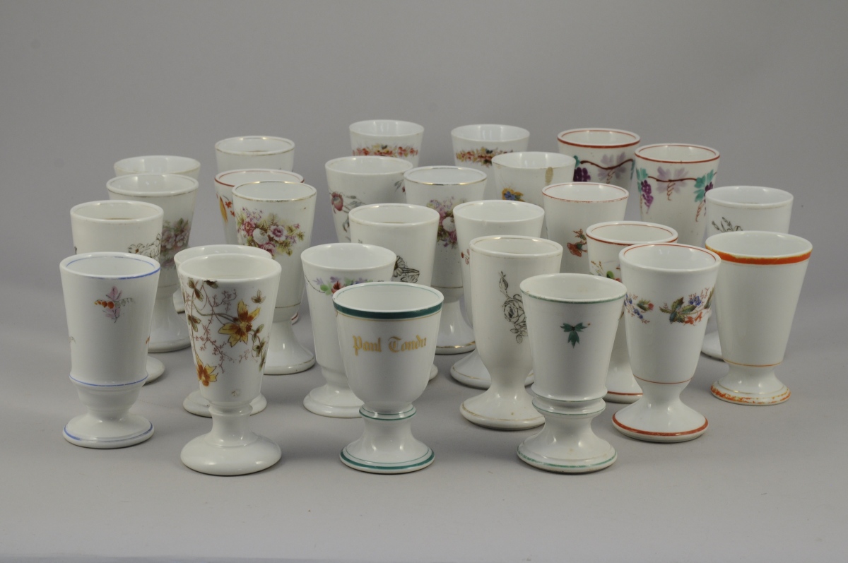 RÉUNION de 70 MAZAGRANS de forme conique sur piedouche en faïence fine, porcelaine ou grès dont un orné de filets verts et filet or portant, en lettres gothiques or, l'inscription "Paul Tondu" ou un autre à décor rayonnant de guirlandes de fleurs polychromes peintes à la main.