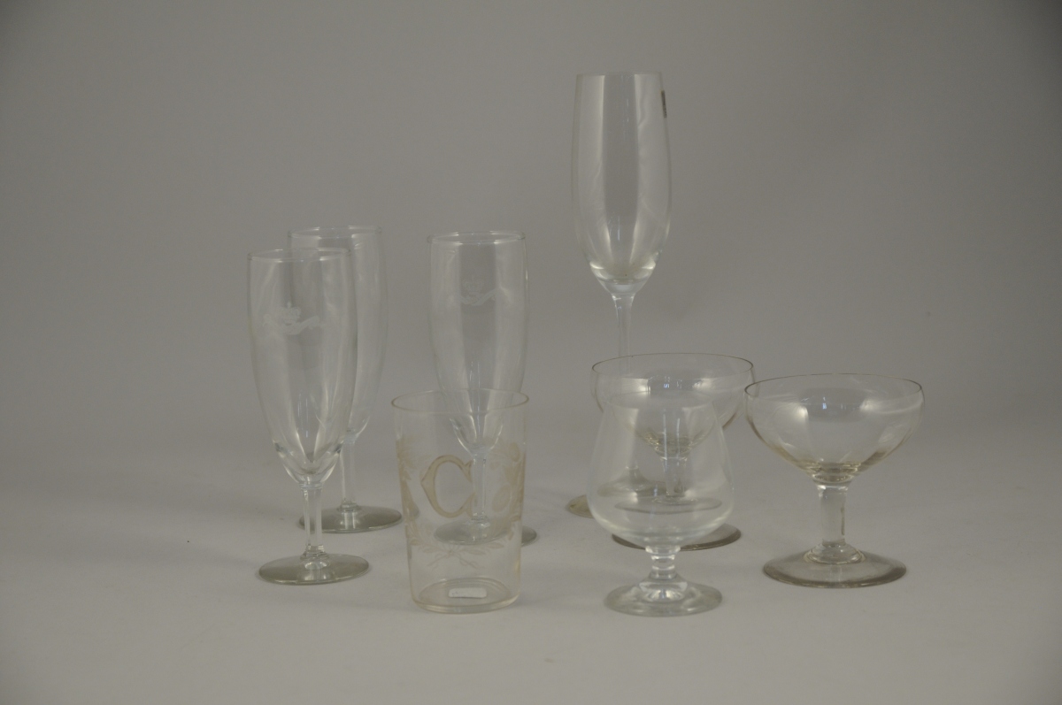 -Trois flûtes à champagne en verre. Le pied à pans coupés, le corps recevant un ornement appliqué à l'imitation de la gravure représentant une couronne fermée soulignée d'un phylactère portant la devise des Castellane : "MAY D'HOUNOUR QUE D'HOUNOURS" pour le champagne Castellane à Epernay. XXème. Haut. 17, Diam. 5,5 cm.