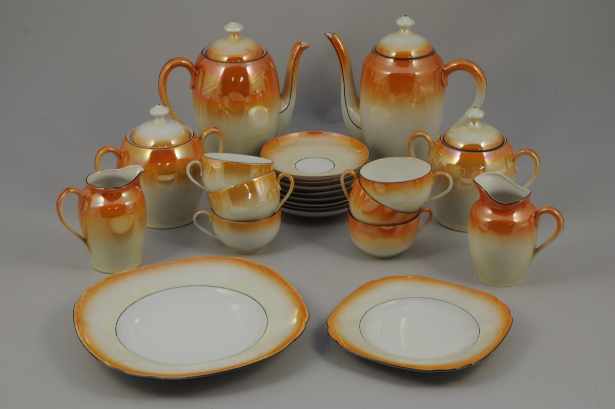 RÉUNION de deux parties de service, en porcelaine émaillée d'un dégradé d'orange et de jaune et filets noirs composée de 110 pièces et comprenant : 35 tasses et 36 sous-tasses, trois pots à lait, deux pots à sucre, deux verseuses, 37 assiettes à dessert et cinq grandes assiettes. Ces deux parties de service présentent d'infimes différences quant à l'émaillage et aux formes. Sous une tasse on trouve la marque "DEUTSCHLAND" et sous une autre "MADE IN CZECHOSLOVAKIA". XXème. (usures et accidents)