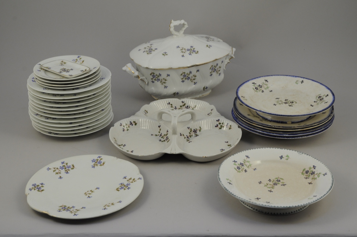 PARTIES DE SERVICES en porcelaine blanche, décor dit "Barbeaux" de jetés de bleuets comprenant 27 pièces : une soupière ovale à décor de filets or, un plat à hors-d'oeuvres côtelé, deux assiettes montées, une coupelle, cinq assiettes à décor de peignés bleus dont une creuse, un petit plat rond, quatre sous-tasses et 12 assiettes à dessert. Certaines pièces marquées Limoges et Creil et Montereau. Fin XXème. (usure et égrenures)