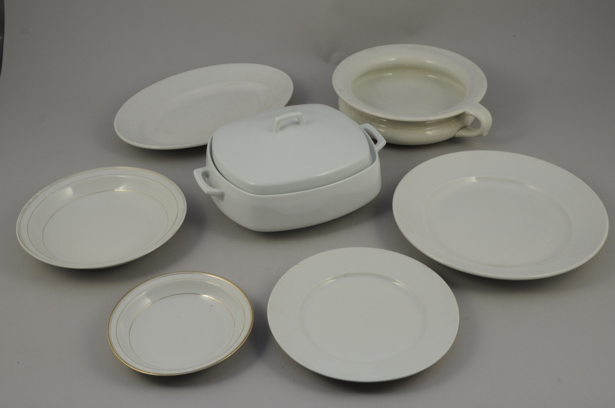 Un plat couvert, un crachoir, un plat ovale, un plat rond, une assiette, une assiette et une coupelle à filet or. XXème. (usures, un petit éclat et fêles)