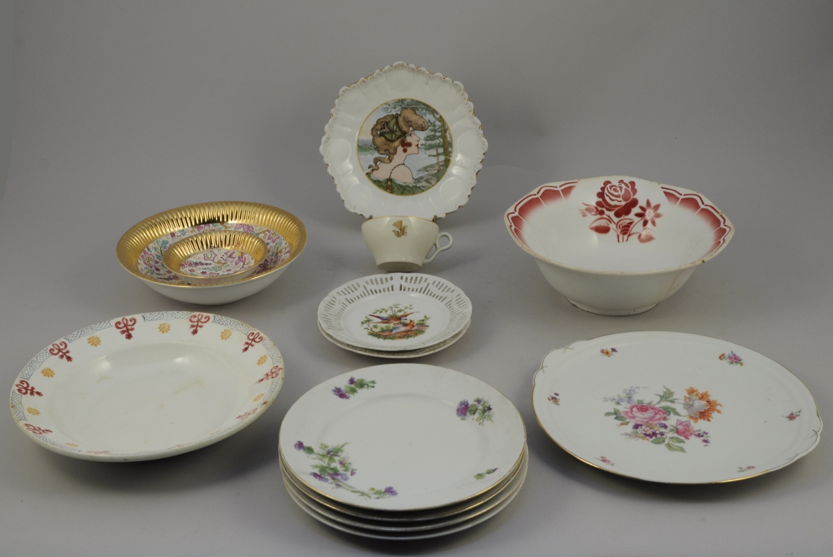 Un saladier à décor en camaïeux rouge d'un bouquet de fleurs; un plat rond à oreilles à décor polychrome floral et filet or; un plat rond présentant une frise polychrome de croisillons, rosaces et lambrequins; un compotier et une coupelle à décor floral sur le bassin, l'aile godronnée dorée; une suite de quatre assiettes à décor au naturel de chardons et filet or ; une assiette à bords mouvementés à décor polychrome d'une jeune femme de profil dans le goût Art Nouveau; une paire d'assiettes à décor polychrome d'oiseaux branchés, aile ajourée; une tasse blanche à filet or. XXème. (usures, égrenures, éclats et fêles)