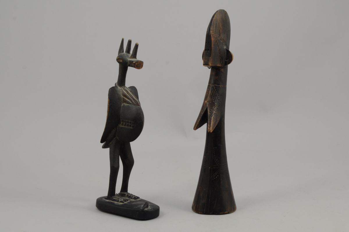 - Une statuette africaine en bois sculpté et noirci figurant un oiseau fantastique. Haut. 26 cm. (accidents et usures).
