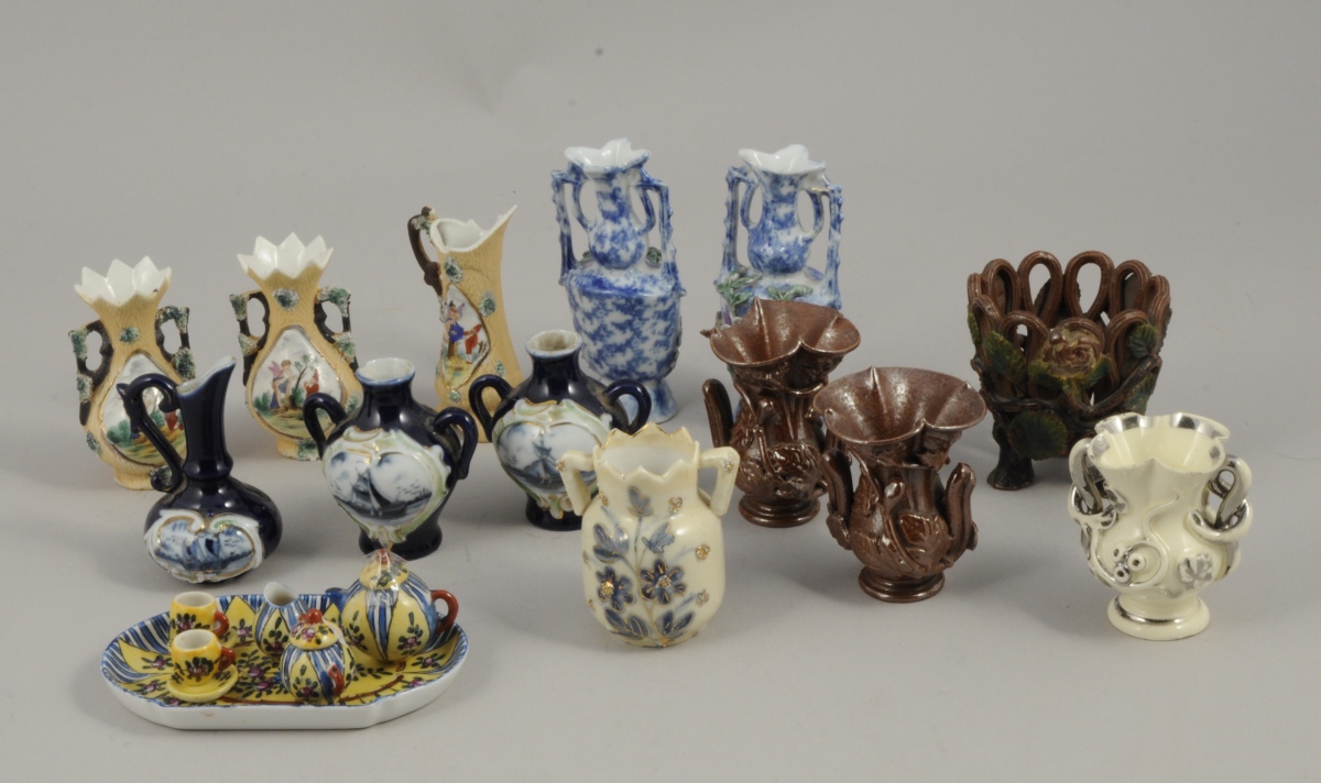 LOT DE FAIENCES MINIATURES comprenant dix vases dont trois en faïence de Langeais, une corbeille tressée en faïence de Langeais, deux aiguières et un service à thé "tête à tête". De 6 à 10 cm environ. (quelques éclats et usures)