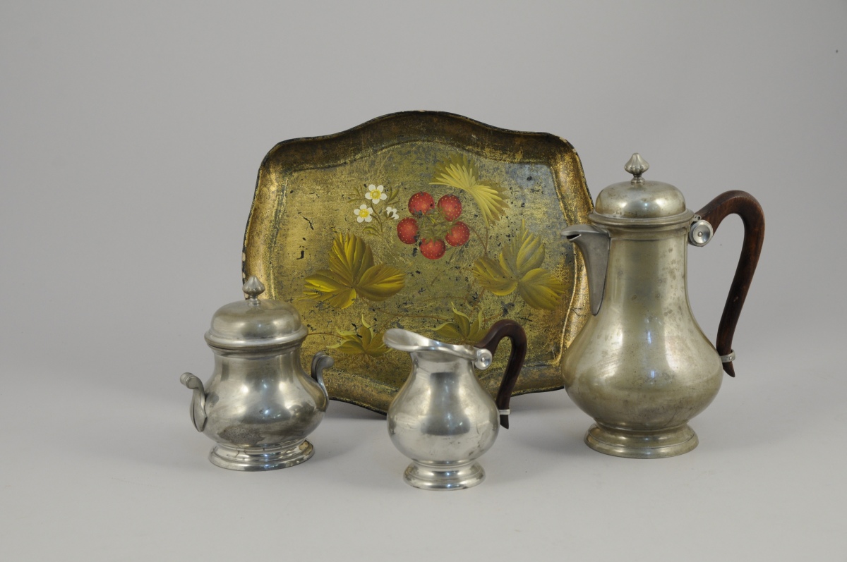 -Un service à thé comprenant une verseuse en étain fin à large panse avec une anse en bois, ( Haut. 24 cm.) un pot à lait en étain fin avec une anse de même (Haut. 11,5 cm.) et un pot à sucre en étain fin muni de deux anses se terminant en volute (Haut. 15 cm).