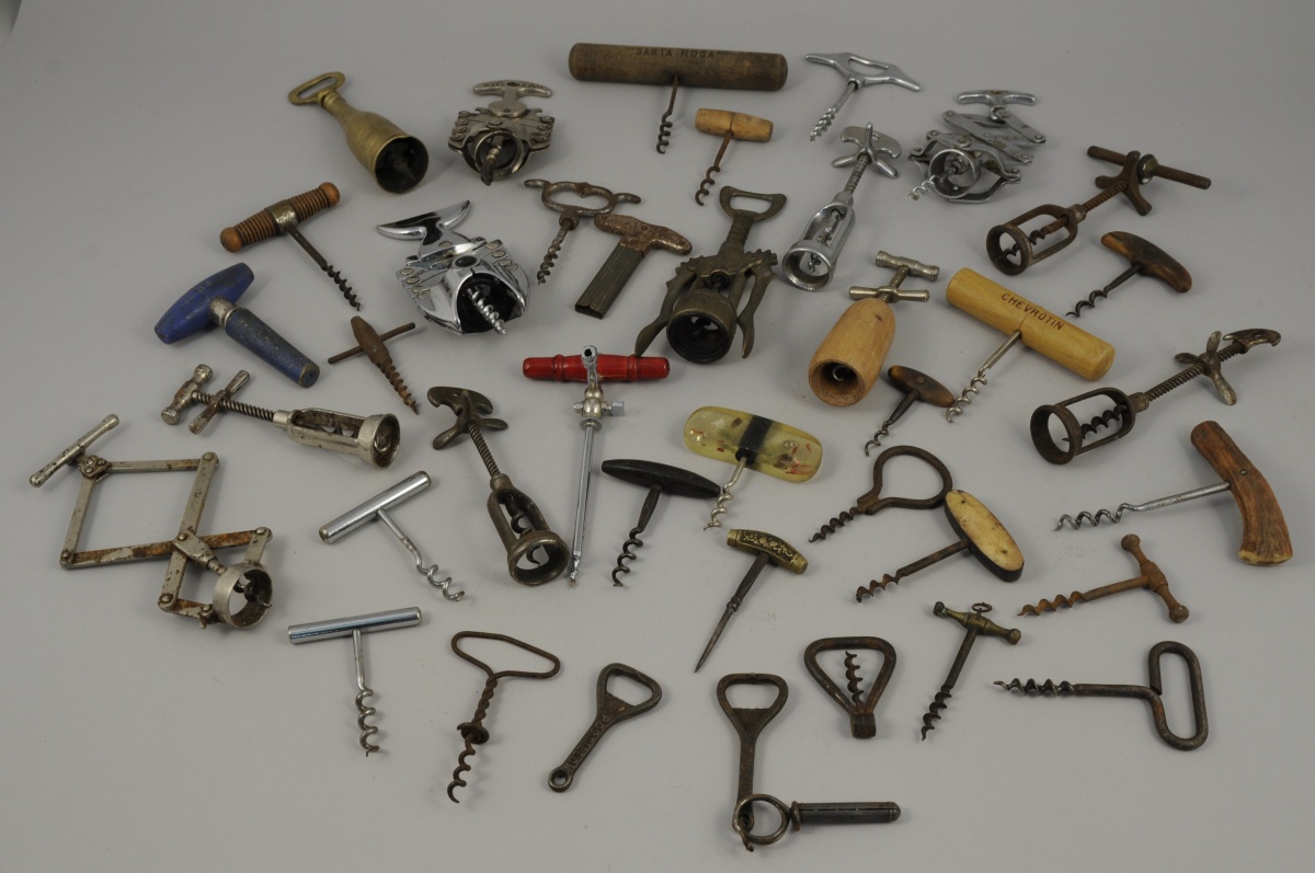 RÉUNION DE TRENTE SEPT TIRES-BOUCHONS de formes, matières et époques diverses dont certains avec l'embout en corne, un en forme de bouteille de champagne daté 1892, un avec robinet, un en laiton décoré de pampres de vigne etc...