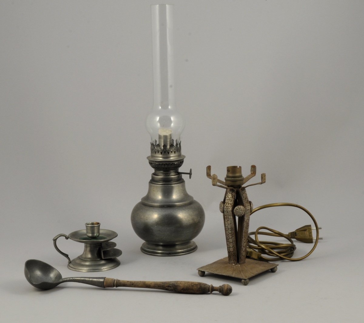 -Une lampe à pétrole à large panse avec son verre. Marque "Étains du Manoir". Haut. 44 cm.