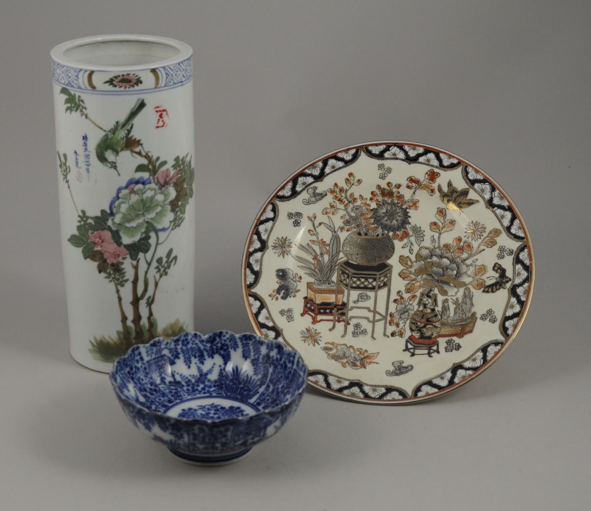 - Un vase tubulaire en faïence fine. Décor polychrome de pivoines et d'un oiseau dans le goût de la Chine. Décor polychrome sur le col de fleurs dans des réserves alternées de croisillons. Idéogrammes chinois en rouge et bleu sous et sur couverte et un ideogramme en rouge au revers. XXème. Haut. 28 cm.