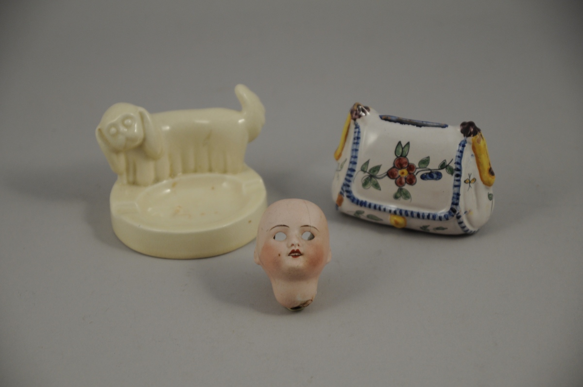 -Un cendrier en faïence fine recouverte d'un émail crème craquelé. Il présente un chien se tenant au dessus du réceptacle. Haut. 8, Long.11 cm.