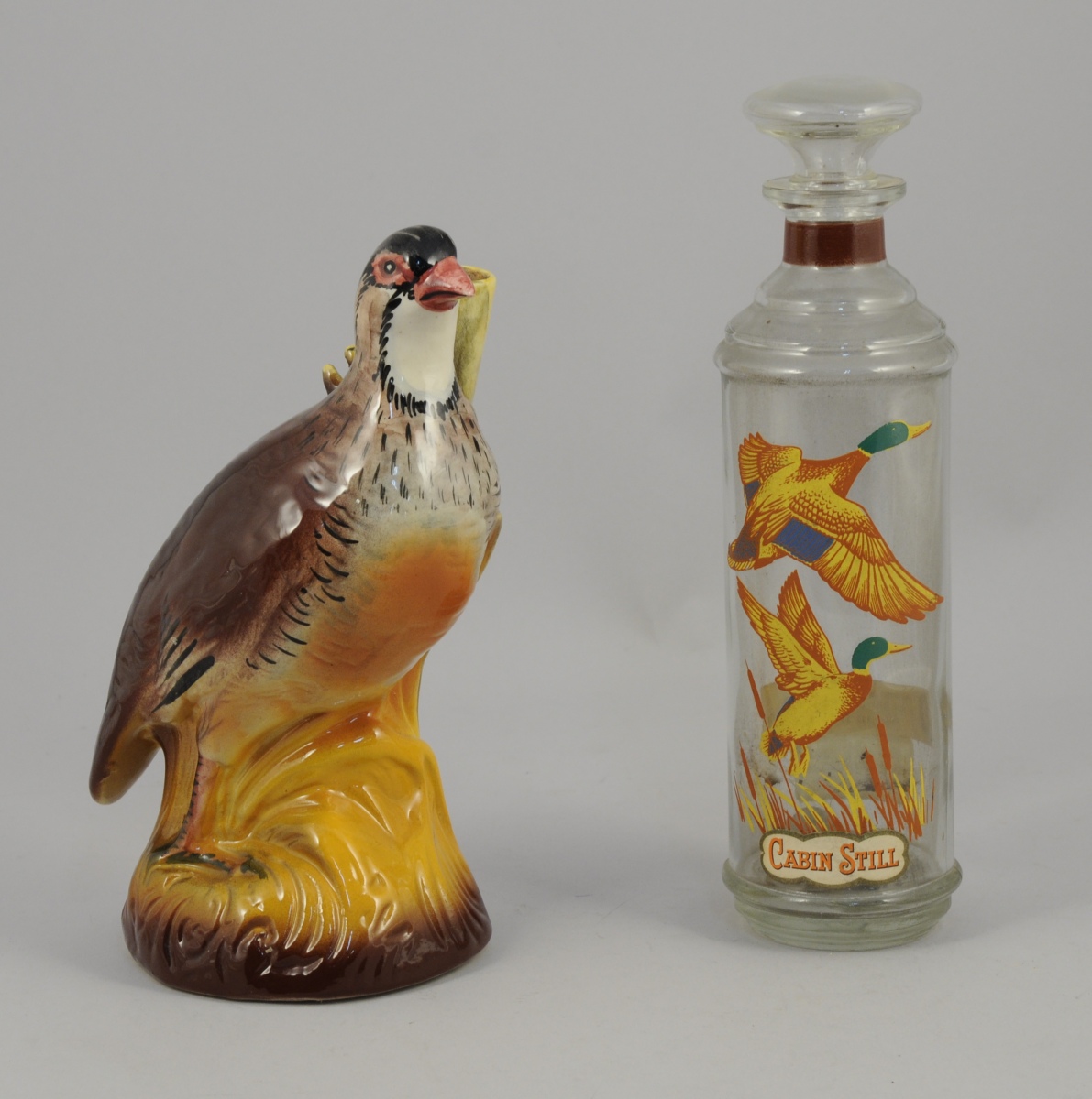 - Un flacon à whisky en verre translucide. Décor polychrome de deux canards colverts en vol au-dessus de joncs. Porte la marque "CABIN STILL". Deux étiquettes au dos provenant de la distillerie Stitzel Weller, Kentucky. Milieu du XXème Haut. 29 cm.