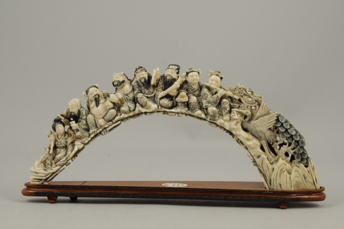 ORNEMENTATION en IVOIRE plaqué reprenant la forme d'une défense d'éléphant. Décor sculpté représentant huit personnages orientaux et un oiseau fantastique dans un paysage rocailleux. Socle en bois vernis. XXème. Haut. 16,8, Long, 35,8, Larg. 5,5 cm.