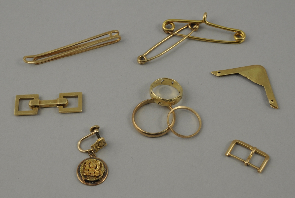 OR À LA CASSE comprenant divers éléments tels que alliances, pince à cravate, épingle à nourrice, boucle d'oreille, bouton de manchette. Poids total : 33,2 g.