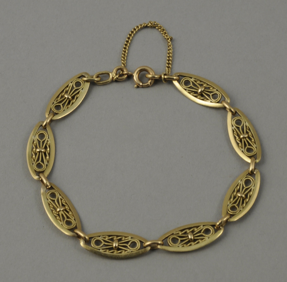 BRACELET en or jaune composé de maillons de forme ovale contenant un décor filigranné. Chaîne de sûreté. Long. 18 cm. Poids : 9,8 g.